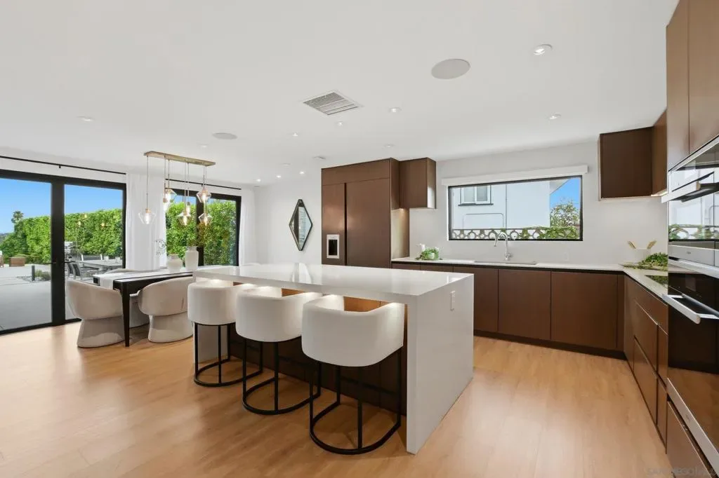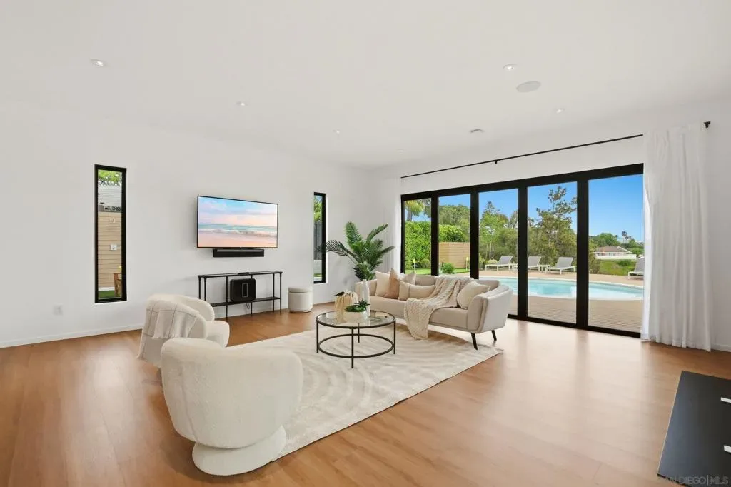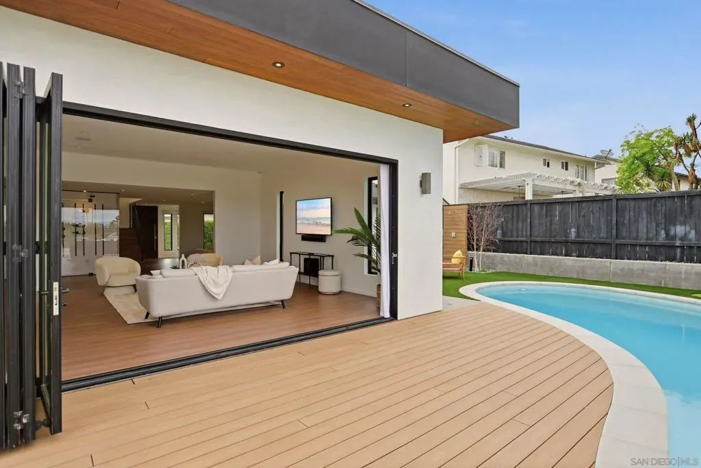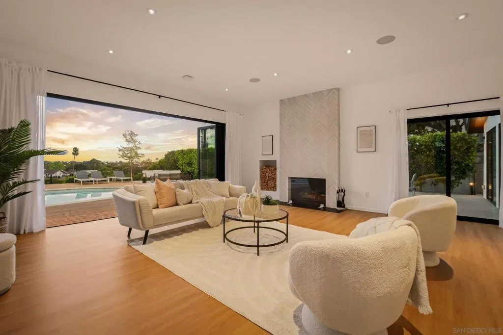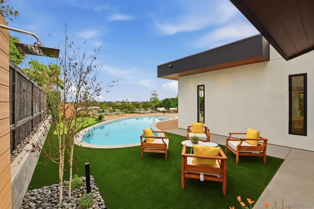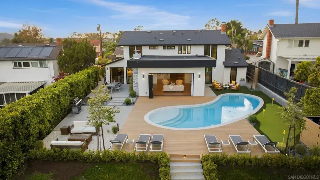 This exceptional residence in the heart of University City has been completely reimagined with a modern & elevated design throughout, including a thoughtfully designed ADU with kitchenette & private entrance, ideal for guests, extended family, rental income, or a dedicated home office. The home features new mechanical, electrical, plumbing, roof, drainage, & irrigation, offering the ease of a fully electric property with modern efficiency. Interior spaces blend sophistication & functionality with Savant whole-home automation, integrated Sonos audio, automated shades, recessed LED lighting, & commercial-grade WiFi extending throughout the home & backyard. At its center, a chef’s kitchen showcases Miele appliances, custom soft-close cabinetry, a generous island, & walk-in pantry, flowing effortlessly into expansive living areas enhanced by La Cantina doors & a striking 15-foot accordion opening, creating a true indoor-outdoor lifestyle. The primary suite is a private retreat with tranquil backyard views, complemented by a spa-inspired bathroom featuring heated floors, an oversized soaking tub, dual showerheads, & refined finishes. Outdoors, the home transforms into a resort-style setting with a fully upgraded pool, Baja shelf, new equipment, Apex wood-like decking, putting green, multiple lounge & dining areas, & sweeping canyon views. Additional highlights include advanced security features, beautifully landscaped grounds with privacy hedging & fruit trees, & a premier cul-de-sac location in one of University City’s most desirable pockets.