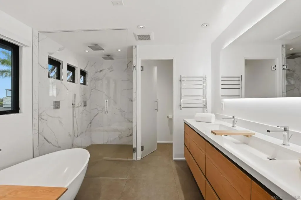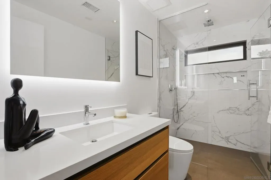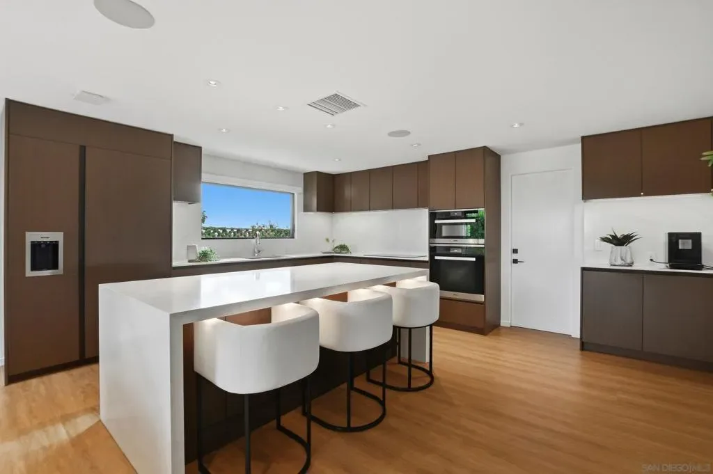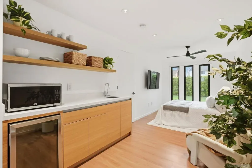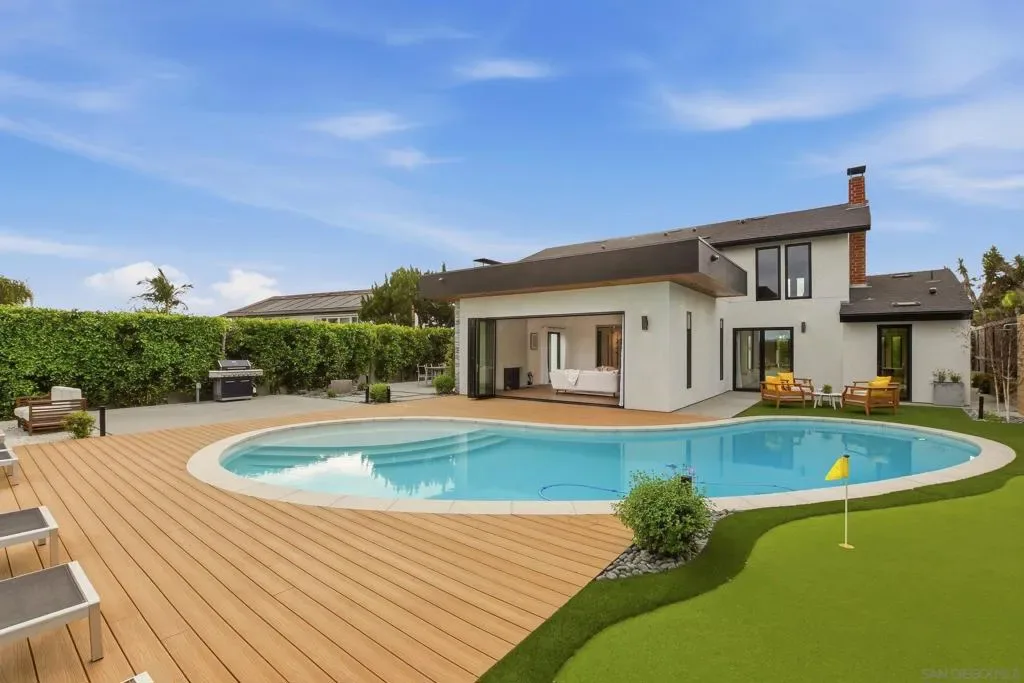 This exceptional residence in the heart of University City has been completely reimagined with a modern & elevated design throughout, including a thoughtfully designed ADU with kitchenette & private entrance, ideal for guests, extended family, rental income, or a dedicated home office. The home features new mechanical, electrical, plumbing, roof, drainage, & irrigation, offering the ease of a fully electric property with modern efficiency. Interior spaces blend sophistication & functionality with Savant whole-home automation, integrated Sonos audio, automated shades, recessed LED lighting, & commercial-grade WiFi extending throughout the home & backyard. At its center, a chef’s kitchen showcases Miele appliances, custom soft-close cabinetry, a generous island, & walk-in pantry, flowing effortlessly into expansive living areas enhanced by La Cantina doors & a striking 15-foot accordion opening, creating a true indoor-outdoor lifestyle. The primary suite is a private retreat with tranquil backyard views, complemented by a spa-inspired bathroom featuring heated floors, an oversized soaking tub, dual showerheads, & refined finishes. Outdoors, the home transforms into a resort-style setting with a fully upgraded pool, Baja shelf, new equipment, Apex wood-like decking, putting green, multiple lounge & dining areas, & sweeping canyon views. Additional highlights include advanced security features, beautifully landscaped grounds with privacy hedging & fruit trees, & a premier cul-de-sac location in one of University City’s most desirable pockets.
