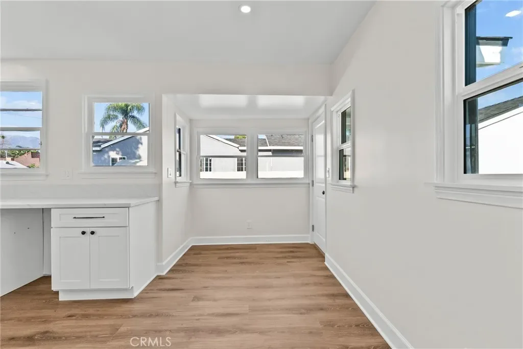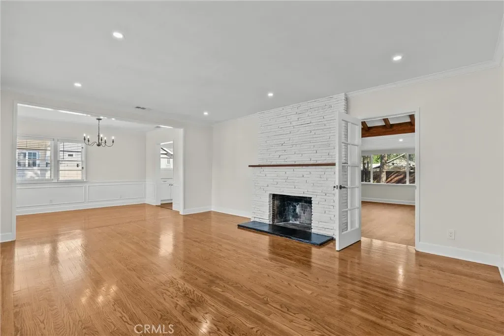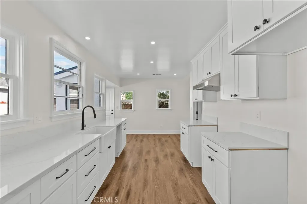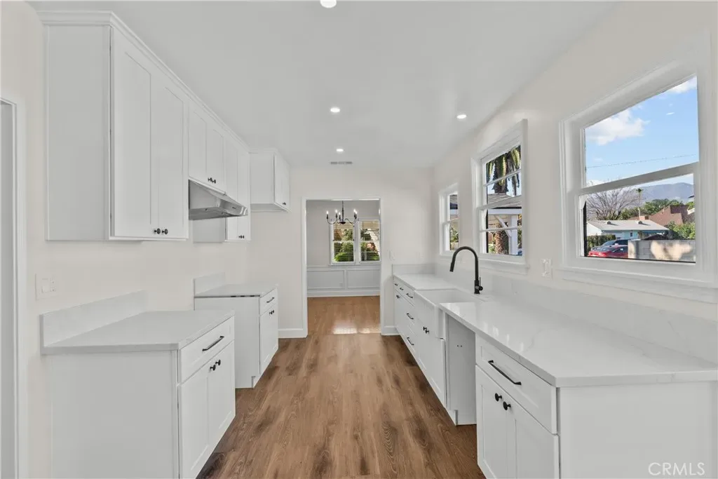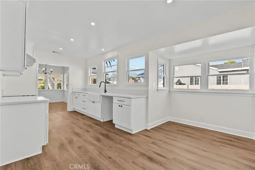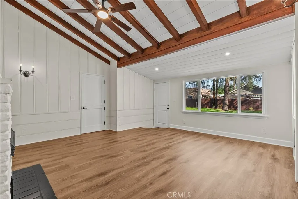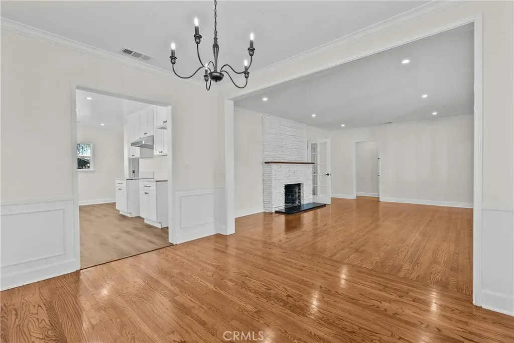 Inside, the home features beautiful wood flooring, vaulted ceilings, and an open, airy layout that enhances the sense of space throughout. Elegant wainscoting details add warmth and architectural character to the living areas. The fully remodeled kitchen is a standout feature, showcasing quartz countertops, a farmhouse-style sink, soft-close cabinetry, and modern finishes that blend both style and functionality.