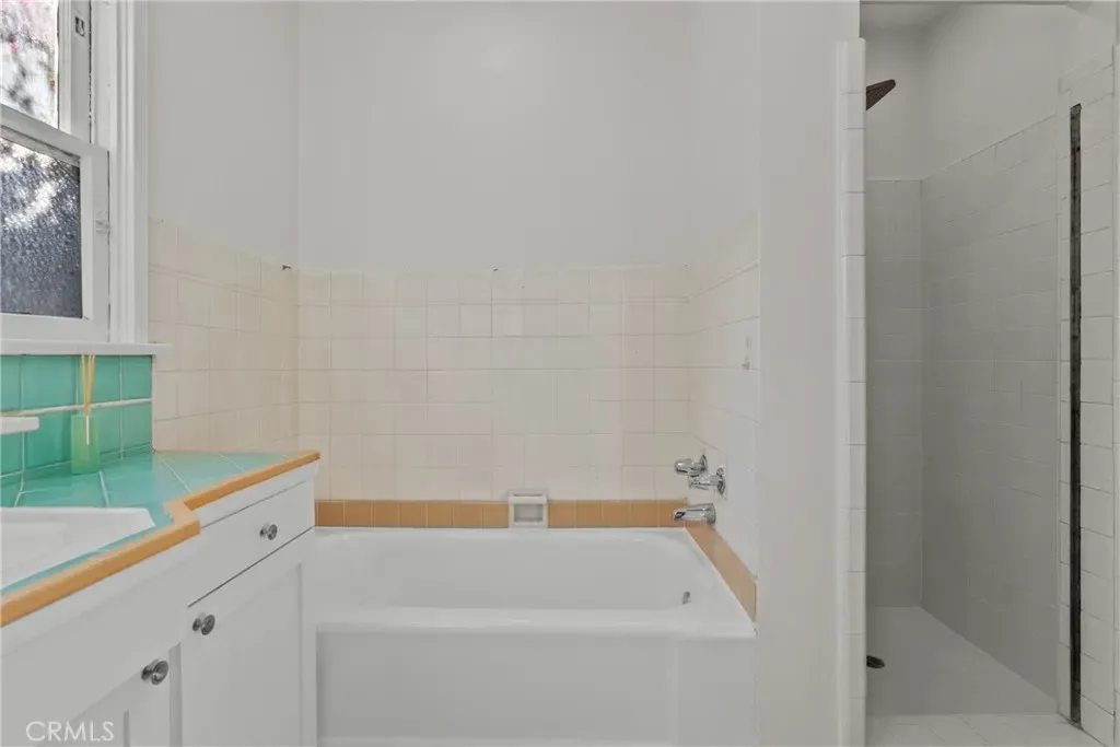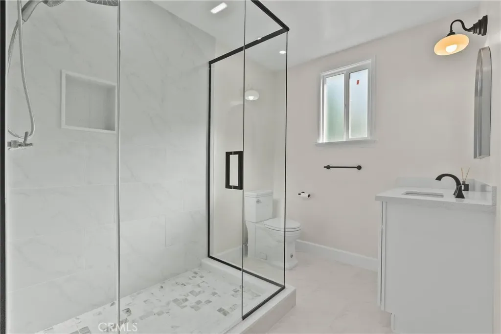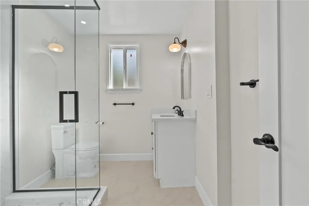 The primary bathroom has been completely remodeled with contemporary upgrades and a clean, refined design.