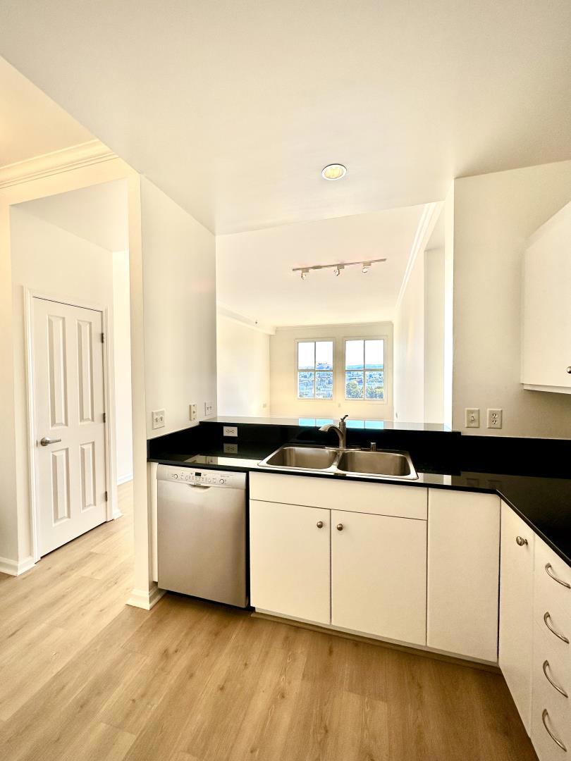 Bright, serene top-floor 1BR/1BA condo at the crossroads of SoMa, Mission, Hayes Valley, and Civic Center. Airy open-concept layout with high ceilings, classic molding, and new hardwood floors throughout. Kitchen features black granite countertops and like-new stainless electric appliances. Updated bath showcases natural stone, modern gold fixtures, and in-unit washer/dryer. Spacious bedroom includes a huge walk-in closet, ideal for a home office plus built-in shoe storage. Additional linen and utility closets provide ample storage. South-facing windows flood the home with natural light and offer stunning sunset views spanning the Mission District to Bernal Peak. Solid concrete walls ensure exceptional soundproofing. LED track lighting in the living room and HomeKit-compatible smart ceiling fans with lights in both rooms. Full amenities include a 24/7 gym with yoga/dance studio, courtyard with BBQs, conference room, and secure package area. Excellent walk, bike, and transit access: buses 49 and 14/14R at the door, 10-minute walk to Van Ness Muni and 16th St Mission BART. Tech shuttles stop out front. Secure, attached garage parking available for lease, with convenient access via Mission Street and South Van Ness, putting you just seconds from Highway 101.
