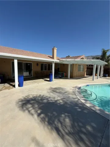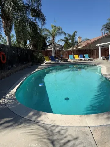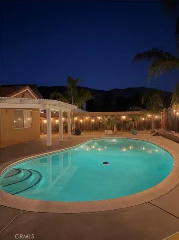 Step outside and experience the true showstopper of this home—a beautifully designed backyard retreat. The custom covered and lattice patio creates an inviting space for outdoor dining, lounging, and entertaining, all while overlooking the sparkling pool. Surrounded by mature palm trees and enhanced with ambient lighting, the backyard offers a resort-like atmosphere that’s perfect for both relaxing evenings and lively gatherings. A newer pool pump adds peace of mind, while the fenced side yard—currently used as a dog run—provides additional versatility. Ample driveway and street parking complete the package.