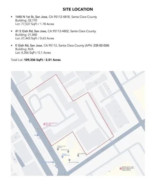This sale includes three contiguous parcels totaling approximately 2.51 acres of prime land located just half a mile from San Jose Mineta International Airport and less than three miles from Downtown San Jose and San Jose State University. *** 1440 N 1st St (APN: 235-02-032) — 1.78 acres, currently San Jose Airport Inn *** 41 E Gish Rd (APN: 235-02-025) — 0.63 acres, currently two commercial buildings *** APN: 235-02-024 — 0.10 acres, used as a parking lot *** Situated directly across from VTA,s Light Rail Gish Station *** Zoned as Urban Village with up to 250* DU/AC (Dwelling Units per Acre) and a Floor Area Ratio of 10.0 (10 times larger than the total lot area). *** Estimated 28,000+ vehicles and pedestrians passing daily along North First Street, the property enjoys exceptional visibility and strong potential for retail or mixed-use activation. *** Exceptional development potential in a highly visible and convenient location.