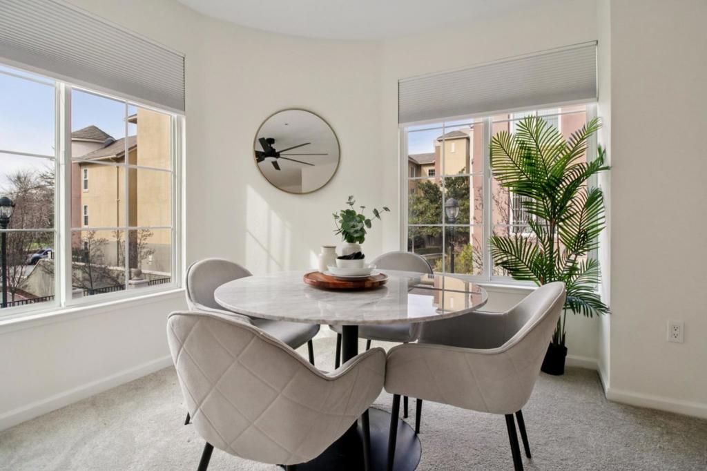 Elegant, light-filled corner residence featuring 2 bedrooms and 2 bathrooms with 1,264 sq ft of thoughtfully designed living space. Expansive windows provide exceptional all-day natural light, enhancing the open and well-appointed floor plan, perfect for both everyday living and entertaining. Recent updates include brand-new carpet, new appliances, and fresh interior paint, offering a truly move-in-ready experience. The home is ideally positioned facing the community entrance and includes two reserved parking spaces in a secure, gated garage. Residents enjoy resort-style amenities including a fully equipped fitness center, swimming pool, hot jacuzzi, reservable event and celebration rooms, guest suites available for overnight visitors, and optional additional storage units for purchase. Centrally located in the heart of Silicon Valley, just minutes from major tech campuses, upscale dining, shopping, and key commuter routes. This exceptional San Jose residence offers the perfect blend of comfort, convenience, and sophisticated urban living. Don’t miss the opportunity to make this stunning home your own.