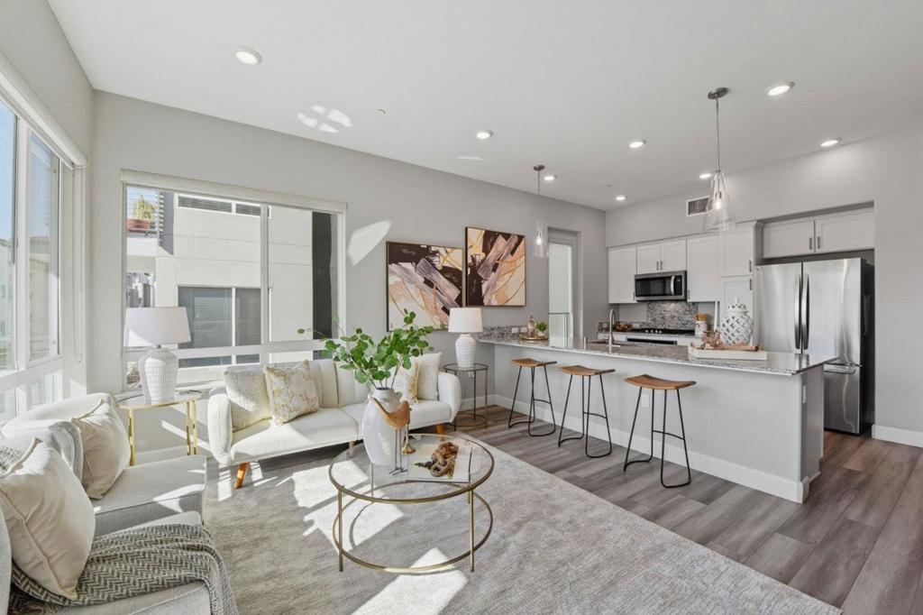 Immaculate and Impeccable Condition! Welcome to this impressive corner 3-bedroom, 2-bath residence in the Latitude community at Communications Hill. Designed for modern living, this end-unit home features an airy open-concept layout filled with natural light streaming from multiple directions. Recessed lighting, expansive windows create a bright, inviting atmosphere throughout. The contemporary kitchen is a true centerpiece, offering a generous island, sleek quartz counters, and premium stainless steel appliances ideal for home chefs and entertainers alike. Step outside through the sliding doors to a private balcony and take in sweeping views of the city and surrounding hills. The primary suite delivers comfort with a spacious walk-in closet and a refined ensuite bath, while additional bedrooms provide flexibility for guests or a home office. Smart touches such as powered window shades and energy-efficient design add everyday convenience. Enjoy the walking trails, nearby Lewis Manly Park, and quick access to shopping, dining, and major commuter routes.