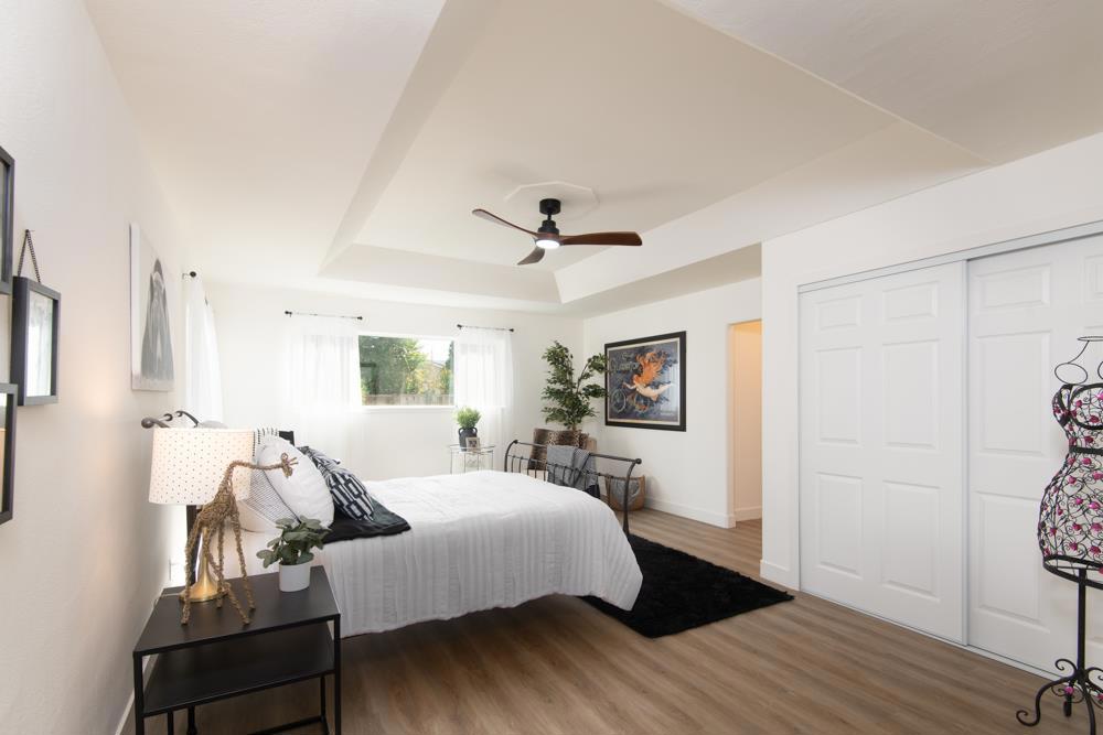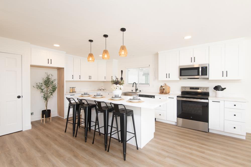 This beautiful home was purchased out of probate and thoughtfully refurbished. As only the second owner the finishes were selected with quality and functionality in mind. The kitchen is light and bright with quartz countertops, matte black hardware, and GE appliances.The large 8 foot island is complete with a wine fridge and is a perfect place to entertain. Interior and exterior paint create a clean, modern feel, complemented by stylish luxury vinyl flooring throughout the main living areas and elegant tile in the beautiful bathrooms. The home features dual-pane windows and Solar power for enhanced energy efficiency and comfort. Both the front and rear yards are landscaped with inviting outdoor spaces framed by mature fruit trees that add charm and character to the property. A standout feature is the self-contained fourth bedroom, complete with its own laundry and kitchen facilities ideal for extended family, guests, or potential rental income. With its blend of tasteful upgrades, versatile living options, additional parking, and finished 2 car garage that is provides move-in-ready condition. This home offers exceptional value and flexibility for today’s buyer.