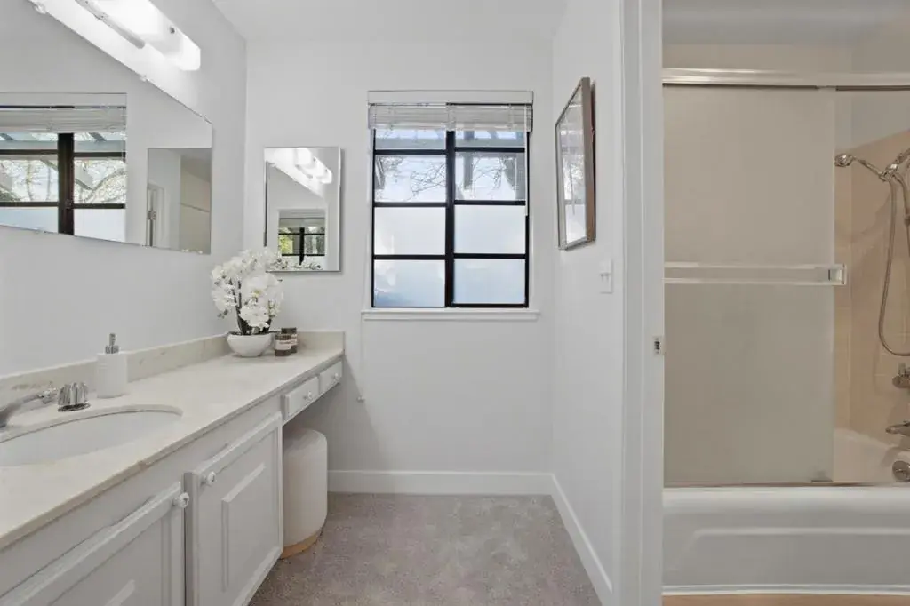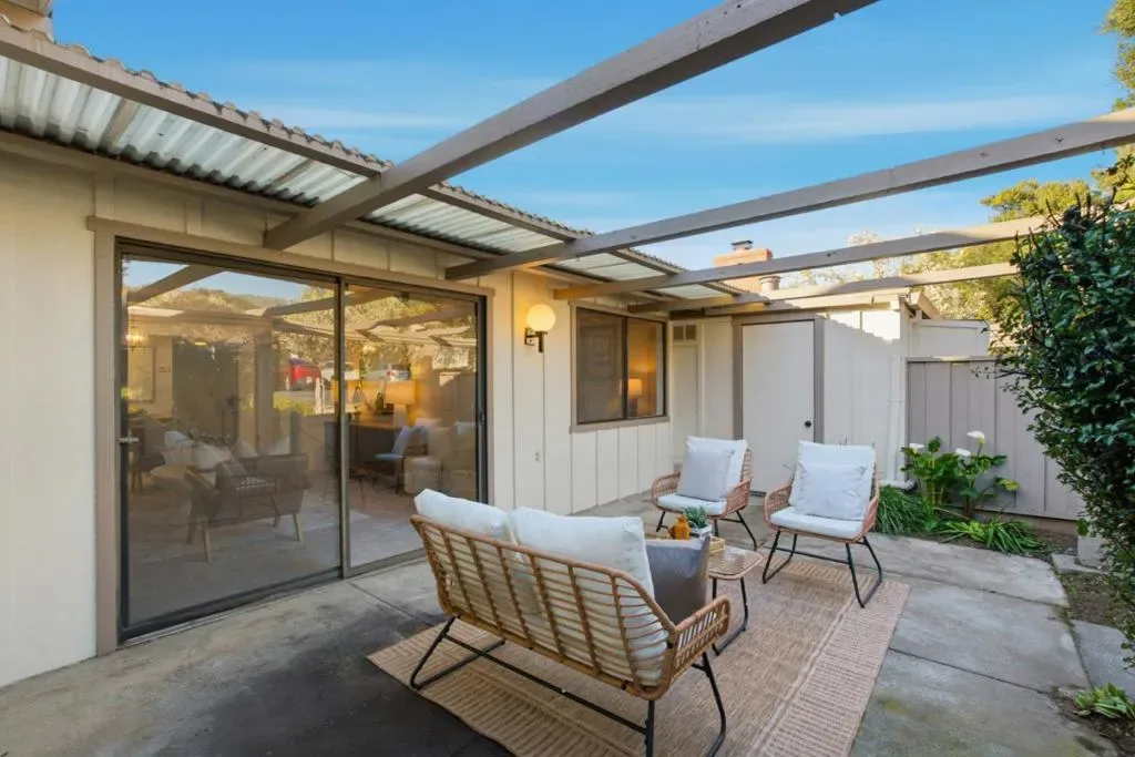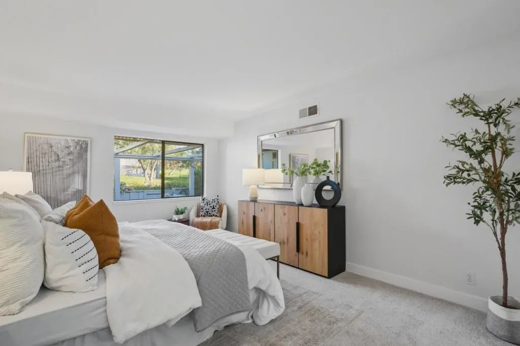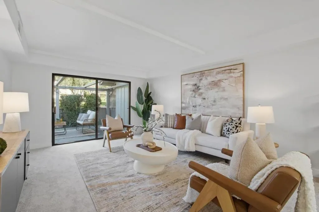 Welcome to this beautifully refreshed, townhome-style single-level residence in the highly sought-after Villages Golf & Country Club, a gated 55+ community known for resort-style living and scenic surroundings. With no units above or below no interior stairs, this home offers exceptional privacy, comfort, and ease of living. Fresh interior paint, new carpet, and LVP flooring create a light & welcoming feel throughout. A beamed ceiling & skylight over the dining area enhance the open, airy atmosphere. The kitchen features abundant cabinetry, generous counter space, and ample storage. The spacious bedroom includes a walk-in closet and the full bathroom offers an oversized vanity with dressing area. Enjoy a large private back patio, set against a tranquil backdrop, perfect for morning coffee, outdoor dining, or quiet relaxation. Residents enjoy outstanding amenities including 24-hour security, multiple pools, tennis and pickleball courts, two golf courses, a fitness center, scenic trails, gardens, and an on-site restaurant and bistro. A vibrant calendar of clubs and social events fosters a true sense of community. Conveniently located near shopping and dining, this home offers low-maintenance living in one of Silicon Valleys most established and amenity-rich communities.