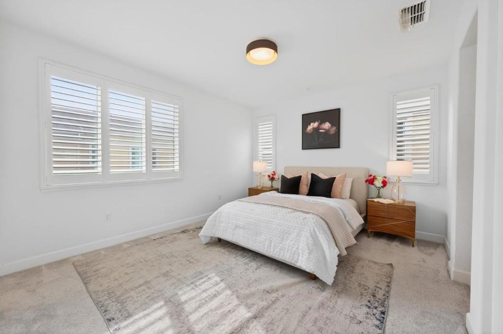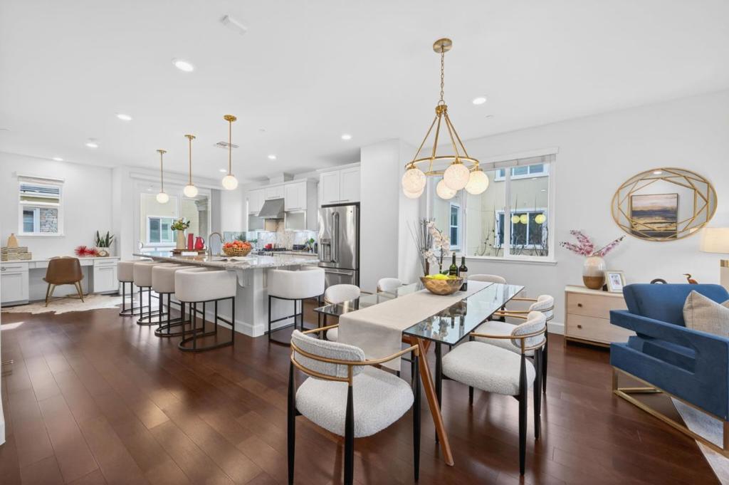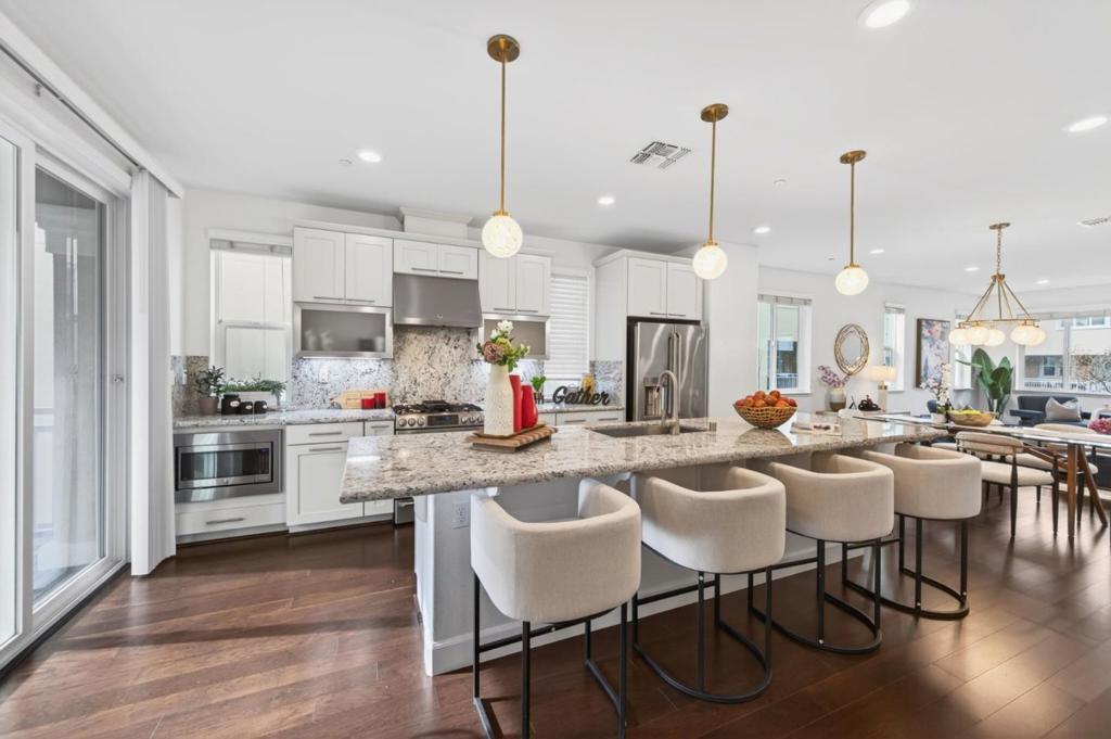Discover elevated living at Avenue One. This turnkey, upgraded 4-bedroom, 3.5-bath end-unit townhome is just 9 years old and is located on the interior side of the community, offering a quieter setting away from freeway exposure. The sought-after floor plan features the community’s largest kitchen island, paired with an expansive pantry. The light-filled open-concept living level flows from the kitchen to the living and dining areas and extends to a private balcony. Finishes include granite countertops, stainless steel appliances with a gas range, soft-close cabinetry, recessed lighting, custom fixtures, and built-in storage. A first-floor bedroom with a full bath offers flexibility for guests or a home office. Upstairs, the primary suite features dual vanities, a walk-in shower, a soaking tub, a walk-in closet, two additional bedrooms, and a side-by-side laundry. Additional highlights include wired AT&T Fiber internet, 3-zone HVAC with independent climate control including an Ecobee smart thermostat, smart-home features, and a two-car garage equipped with 240V EV-ready outlet. Residents enjoy a clubhouse with pool, spa, fitness center, BBQ areas, playground, gated dog park, nearby parks, and convenient access to Costco, Village Oaks, VTA Light Rail, and Highways 85 and 101.