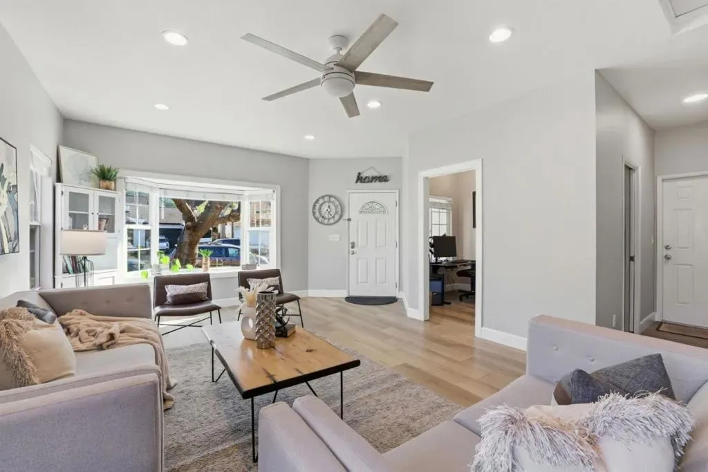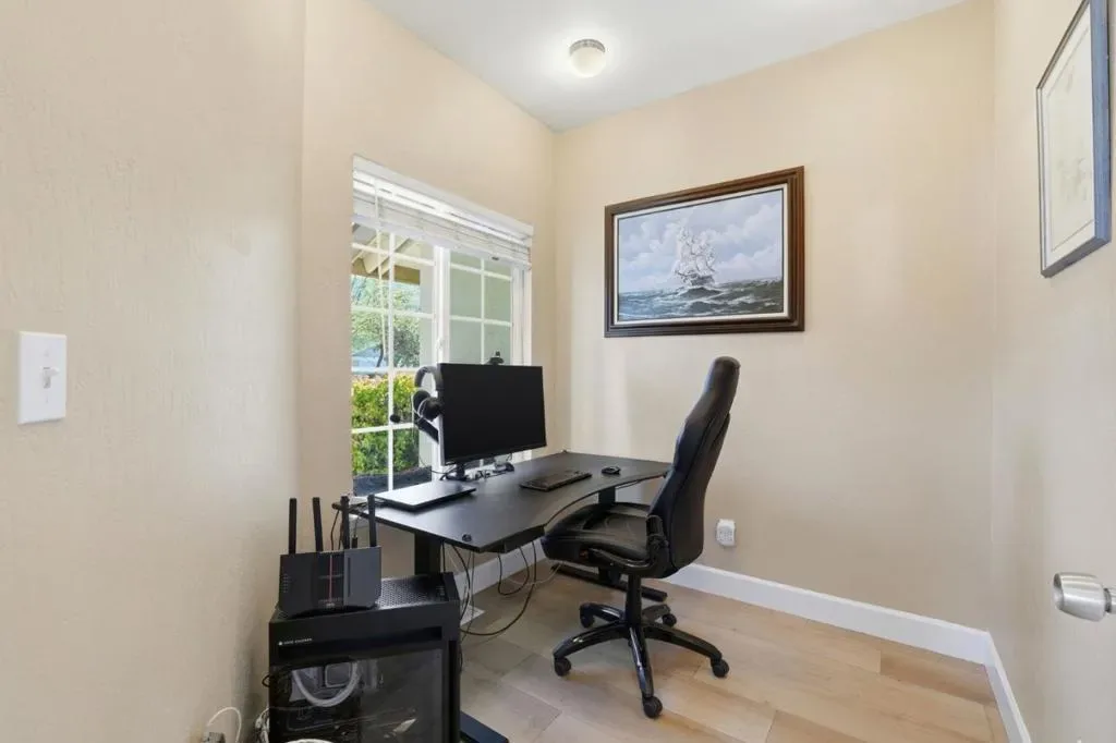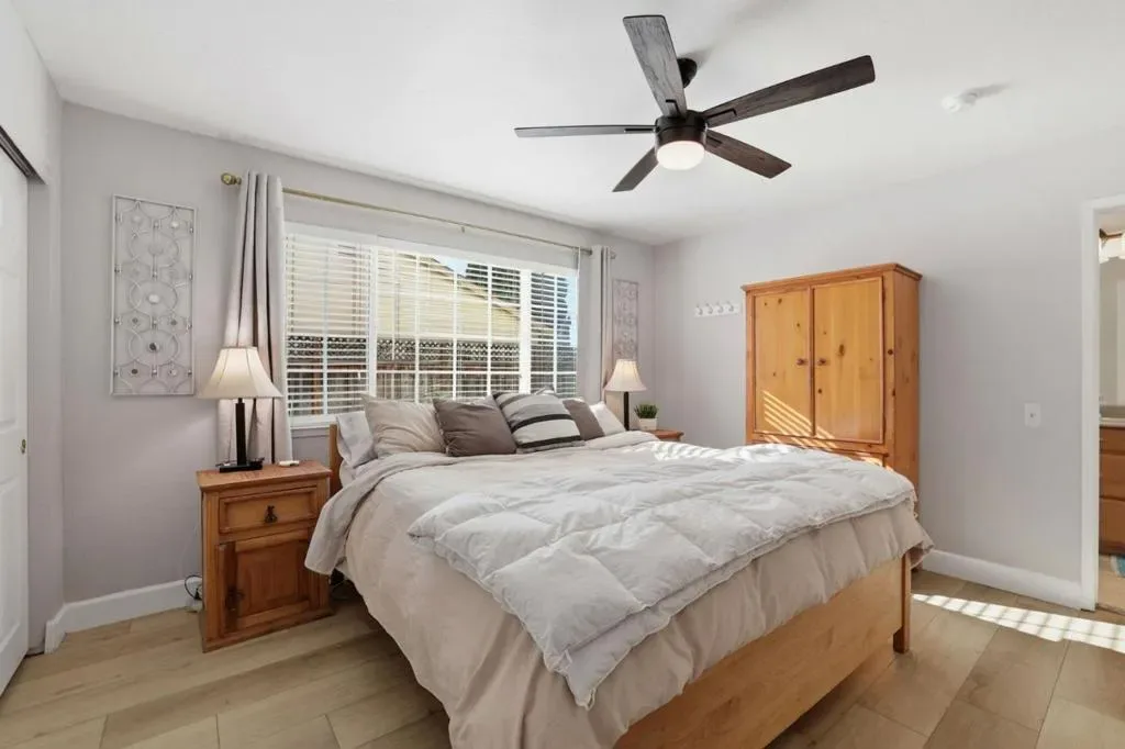Space & thoughtful updates come together in this 4 bedroom, 2.5 bathroom home offering 2,016 sq ft of living space. The kitchen was remodeled in 2021 & features a 6 burner gas stove, stainless steel appliances, cabinet depth refrigerator, recessed lighting, & a large window bringing in natural light while opening to the dining area. The dining space centers around a fireplace with mantel & includes recessed lighting & a sliding glass door to the backyard. The living room welcomes you with a bay window, recessed lighting, & ceiling fan, while the separate family room adds volume & character with a vaulted ceiling. The primary suite is located on the ground floor. Double doors open to the bedroom, which features a wall to wall closet while the primary bathroom includes dual sinks & a walk in tile shower. An office sits at the front of the home, providing a dedicated workspace. All bedrooms include ceiling fans. Flooring updates include new LVP installed downstairs in 2021 & upstairs in 2026, complemented by 6 inch white baseboards. Additional improvements include a replaced furnace in 2018, fully paid solar added in 2013, & updated electrical circuits & breaker panel in 2021. The backyard is designed for low maintenance enjoyment with cemented areas & a pergola for shaded seating.