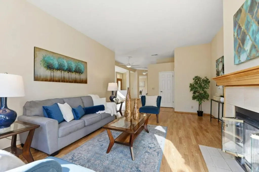 Single level end unit located in The Villages Golf & Country Club, an active, gated, 55+ community. Spacious, filled with light, with fresh paint, and new carpet in the bedrooms. Cozy fireplace in the living room, with access to the rear patio. Two bedrooms, each with their own bath, two and a half bathrooms, and a den provide comfort and convenience. Primary bedroom suite features a large stall shower, dual sinks, walk-in closet, and a door to rear patio. The kitchen is just off the formal dining room and features granite counters, built-in microwave, ample cabinet space, a light and bright breakfast nook with additional breakfast bar and kitchen desk, and a door to the rear patio for easy outdoor entertaining. Plenty of planting space on the rear patio with a brick planter and custom pavers. The two car garage is attached and has built-in cabinets plus room for a golf cart. The Villages is a resort 55+ community and offers many amenities including golf, tennis, pickleball, swimming, fitness center, and many more..