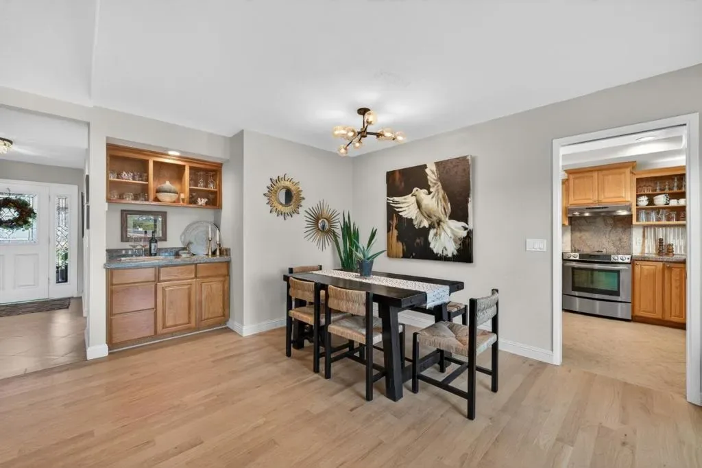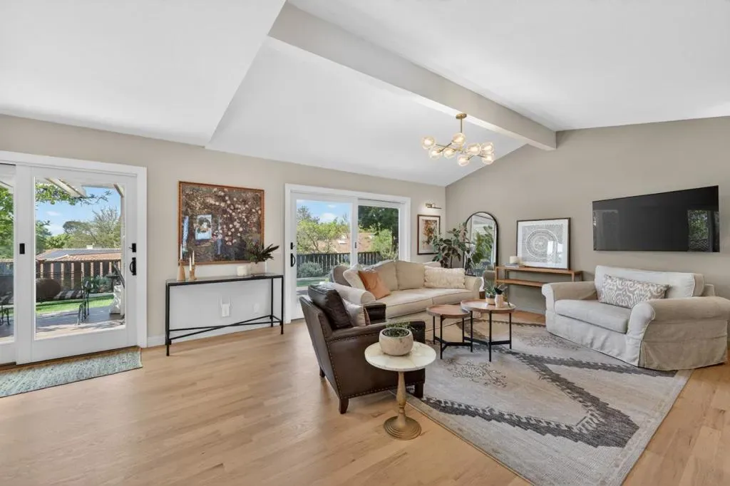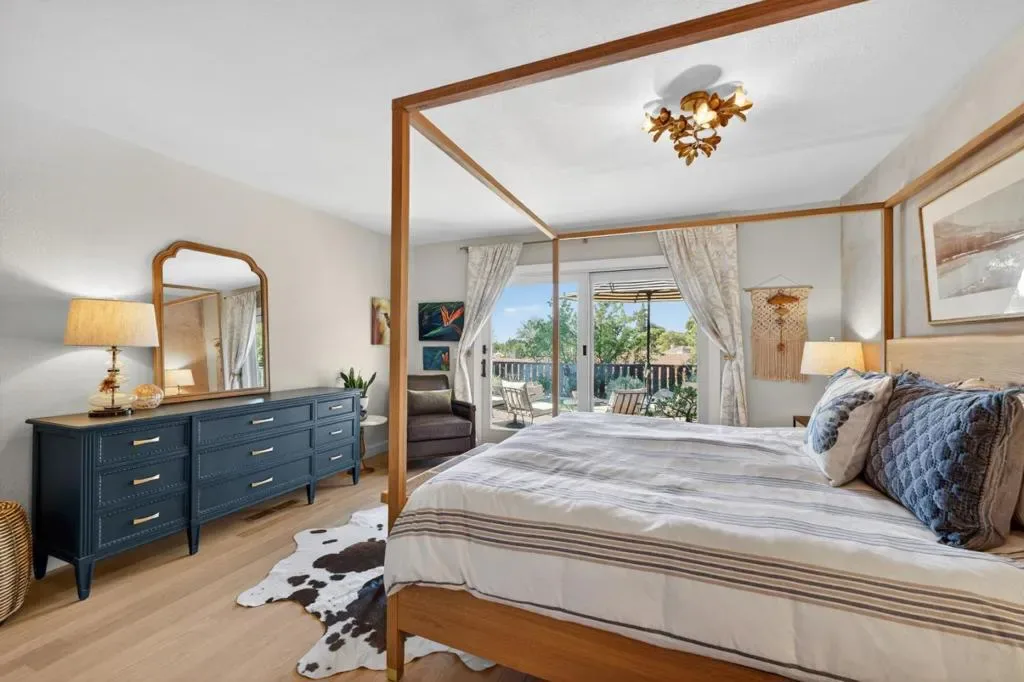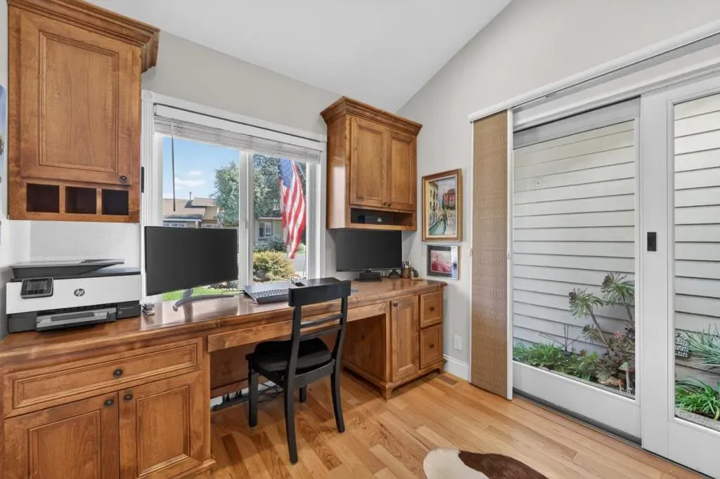This thoughtfully designed 2-bedroom + office, 2-bath home offers comfort, privacy, and connection to community. Hardwood floors flow through an open living and dining area anchored by a striking fireplace wall with open shelving and a generous hearth. Large glass doors open to a beautifully landscaped backyard with unobstructed hill views and no rear neighbors. Outdoor spaces include decking, gardens, trees, and two expansive side yards, one with gated patio access from the breakfast nook. The kitchen features abundant cabinetry, pantry storage, a breakfast nook, and separate dining area for flexible living and entertaining. The remodeled primary suite offers a spacious walk-in closet, designer finishes, natural light, and backyard access through sliding glass doors. The second bedroom connects to a versatile office space with built-in desk and courtyard access. Additional highlights include an attached 2-car garage with direct kitchen entry, attic storage, optional indoor laundry closet and strong curb appeal with layered landscaping and new paint. Located in The Villages with low HOA dues, this home blends privacy with access to an active community. Nearly $200,000 in upgrades and large solar capacity add exceptional value to this already amazing home!