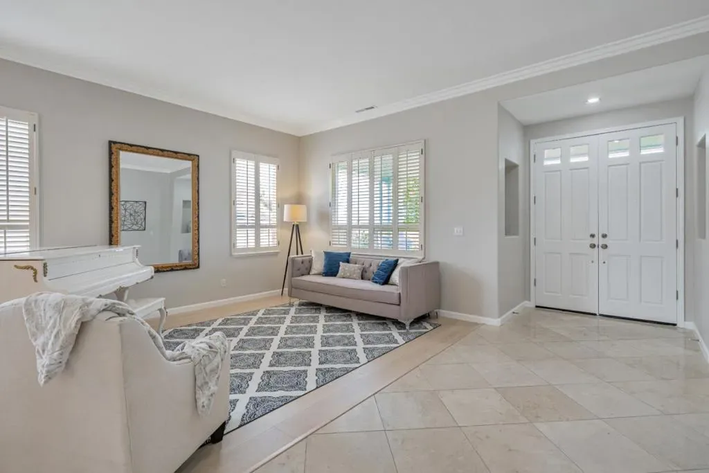 Modern Single One story Detached Open Floor Plan executive home is awaiting for you! This 3Bedroom, 2 bath estate is a rare, large, extremely popular very open floor plan with every room in the house of generous proportions. Low HOA, FREE Electrical/ Gas .- result of the Owned oversized Solar systems. Airy high ceilings throughout, Huge kitchen, gleaming marble flooring, fresh designer paint, recess lighting, crown moldings, oversized view windows & sliding doors. Ample storage kitchen offers maple cabinetry, stylish quartz countertops, huge island, gas stove, pantry. and a fireplace. Large laundry has a lot of extra storage. Primary suite has 2 huge closets, his /hers sinks, an oversized Jacuzzi tub. Beautiful backyard provides quiet private setting & offers dining/BBQ/sitting areas, 2 tier fountain, surrounded by trees, mature bougainvillea bushes, views of the hills. The Villages, 55+ gated, secured community. Unparalleled RESORT lifestyle not found anywhere else! It’s all here, no need to travel…walk to meet friends at the bistro, bar, restaurant, be a part of any of 60 plus clubs. Play golf, pickleball, tennis, bocce ball; hike, swim, dance/ sing/ theater, yoga, gym, garden, park RV, golf cart. Time to learn to relax & enjoy even if you are still working! 9A10 + VALUE!