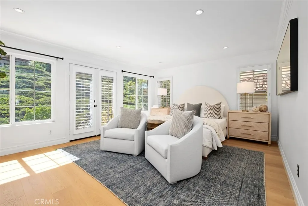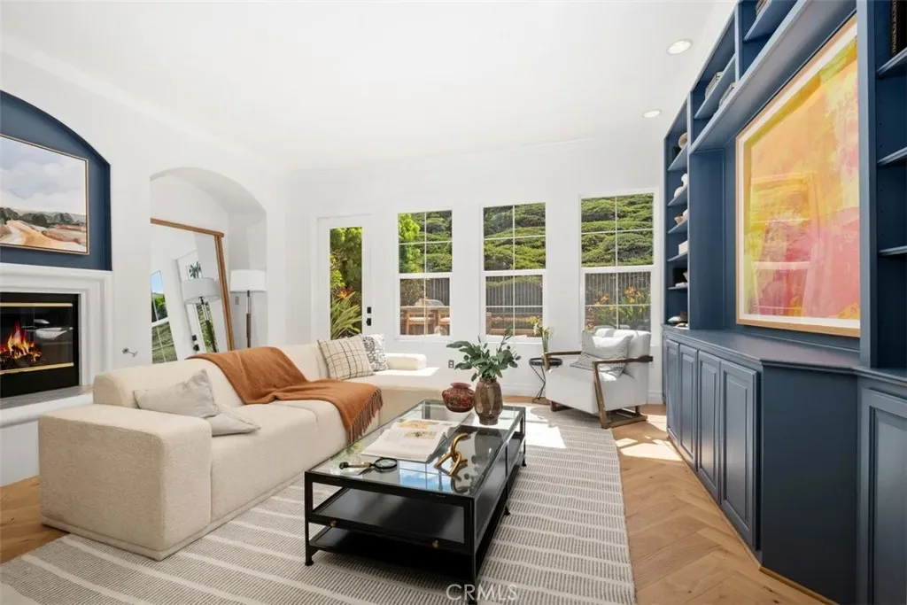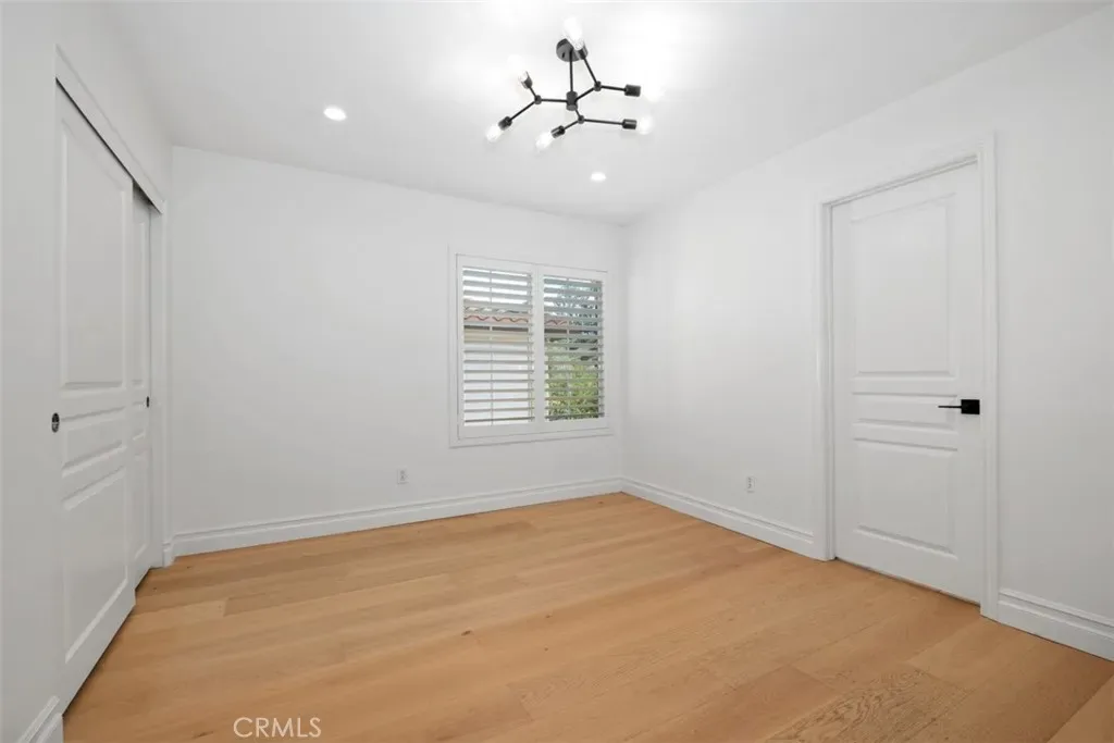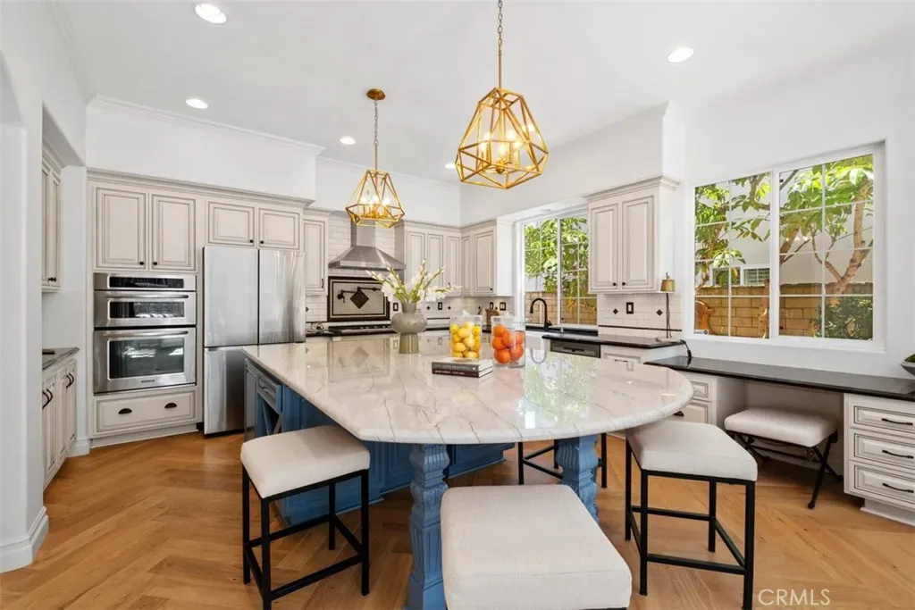 The open-concept family room and kitchen form the heart of the home, ideal for everyday living and entertaining. The kitchen features a large center island with quartzite countertops, custom finishes, premium appliances, pot filler, a generous walk in pantry and exquisite herringbone-pattern white oak flooring. The adjoining family room includes a fireplace, custom built-in cabinetry, and direct backyard access. A main-level en suite bedroom is ideal for guests, along with a separate powder room. Additional highlights include a Butler’s pantry, plantation shutters through-out , recessed and designer lighting, a new HVAC system, Nest thermostat, hardwired EV charging, new washer and dryer, new dishwasher, and Best of All, having a 30+ solar panels which guarantee minimal electric bills and maximum efficiency.