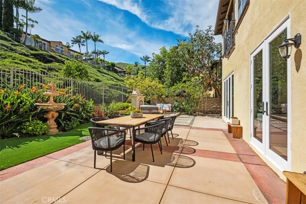 The expansive backyard is designed for relaxation and entertaining, featuring generous outdoor living space, an outdoor fireplace, tranquil water features, and peaceful hillside surroundings.