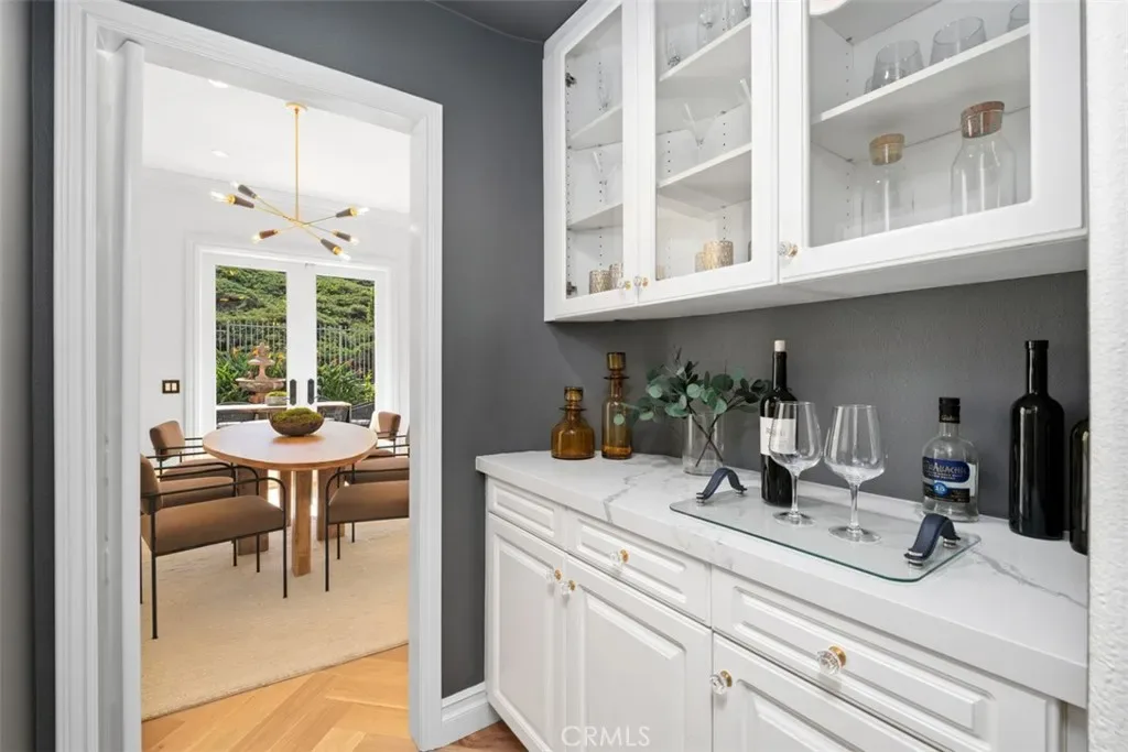 A private courtyard entry leads to a grand foyer highlighted by a statement chandelier and hand-laid European oak flooring. Sun-filled living and dining rooms provide an elegant setting and open to the backyard through French doors, creating seamless indoor-outdoor flow.