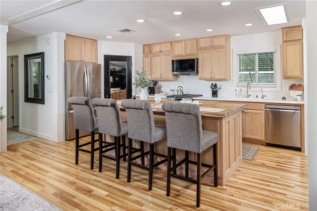 Inside, wood laminate flooring flows throughout, complemented by fresh interior and exterior paint, dual-paned windows, and an abundance of natural light. Oversized windows draw the eye outward to sweeping panoramic views, while a custom fireplace anchors the main living area with warmth and sophistication. The remodeled kitchen blends style and function with remarkable ease, featuring a butcher block island prepared for food prep, upgraded switches and outlets throughout the home. This truly is a generous space for intimate gatherings or everyday living.