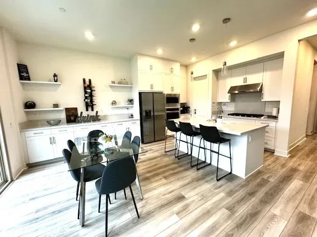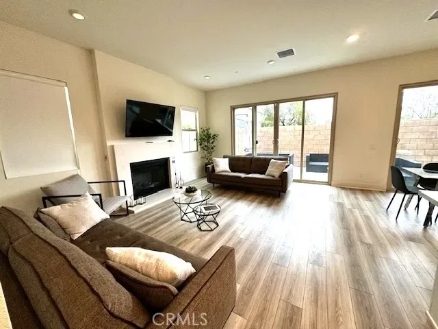 The bright family room features a cozy fireplace and large sliding glass doors that open to a private outdoor patio, creating seamless indoor-outdoor living. The stylish kitchen includes white cabinetry, stainless steel appliances, a large center island with bar seating, and a dining area that flows into the living space. The home is tastefully furnished and features a spacious primary suite with large windows and plenty of natural light. Bathrooms include modern finishes and dual vanities. A convenient upstairs laundry room with washer and dryer is also included.