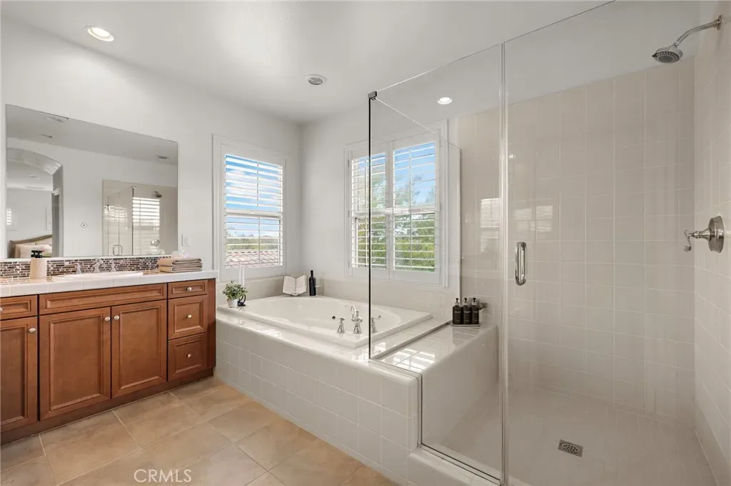 Upstairs, a spacious loft with built-in desk provides a flexible work or study area alongside four additional bedrooms ( one secondary bedroom is a suite room with private full bathroom ) and convenient upstairs laundry. The primary suite offers peaceful views, a large walk-in closet, and a spa-inspired bath complete with dual vanities, soaking tub, and glass-enclosed shower.