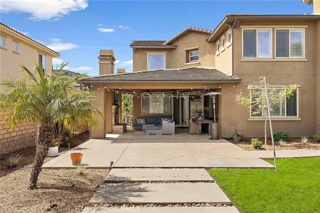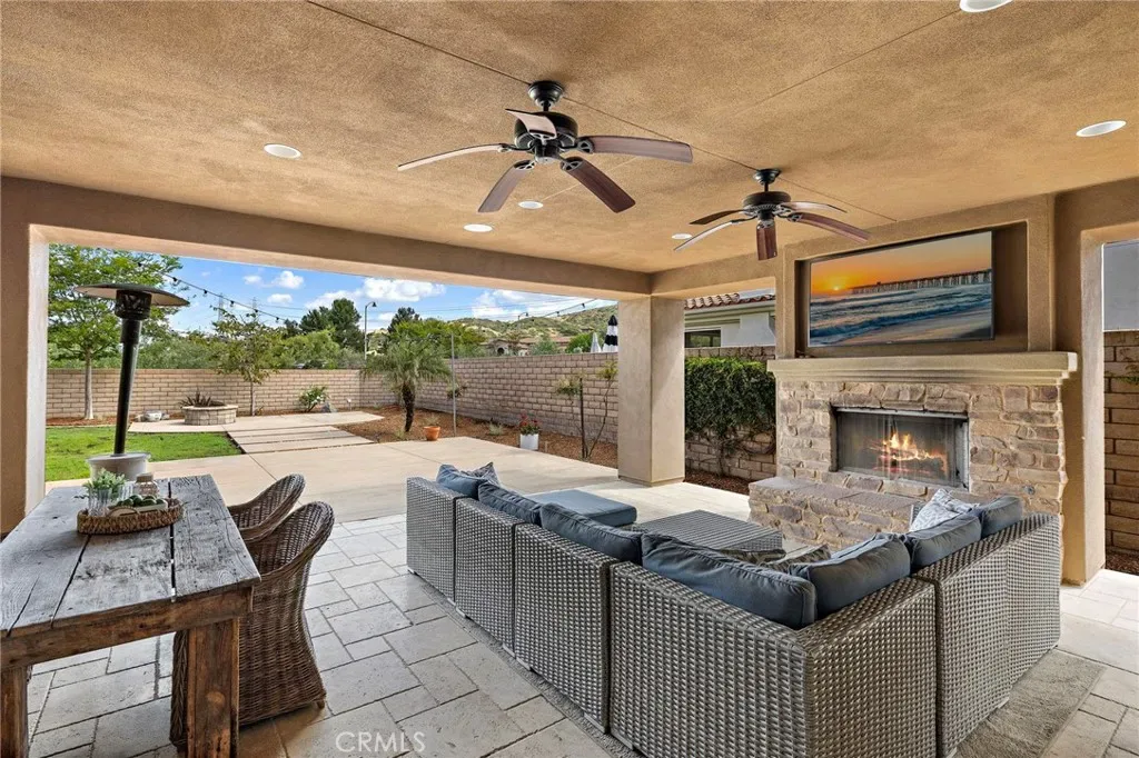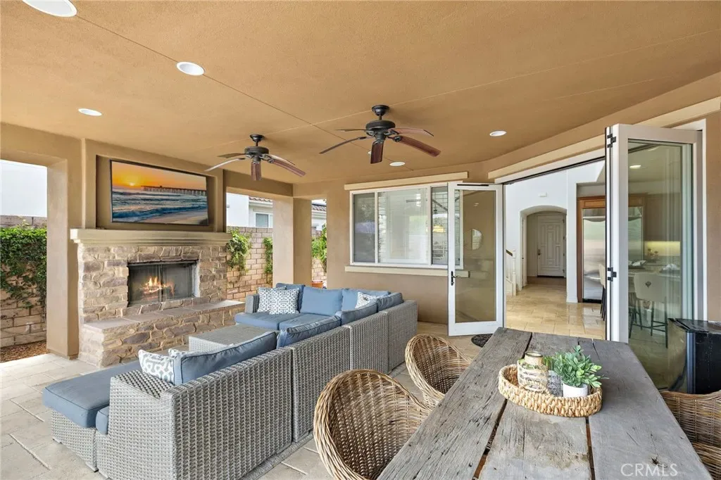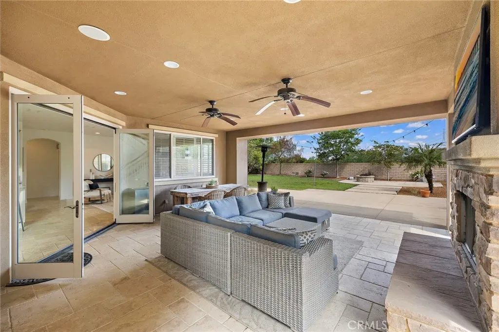 Seamless indoor-outdoor living is achieved through bifold doors that open to a beautifully upgraded backyard featuring custom hardscape, a covered California room w/ fireplace, and lush, mature landscaping, creating a private setting for relaxing or entertaining.