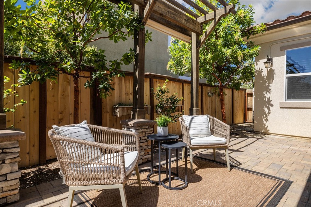 The private backyard is designed as a tranquil retreat, showcasing mature drought-tolerant landscaping that creates a peaceful, park-like atmosphere. A charming pergola-covered patio offers the perfect setting for gatherings, outdoor dining, or simply enjoying the coastal climate.