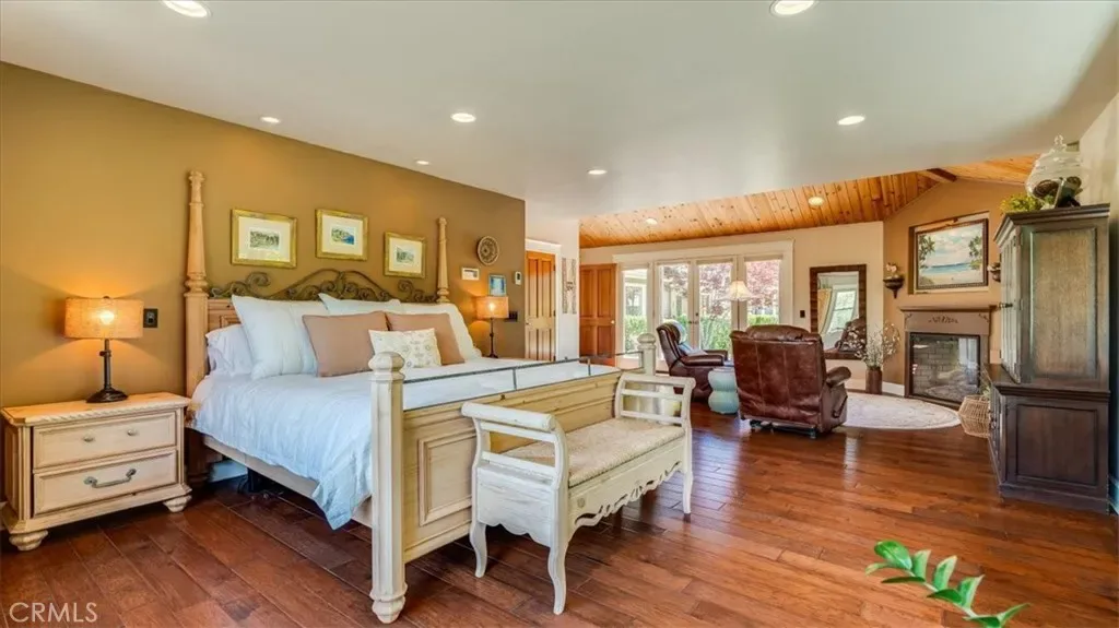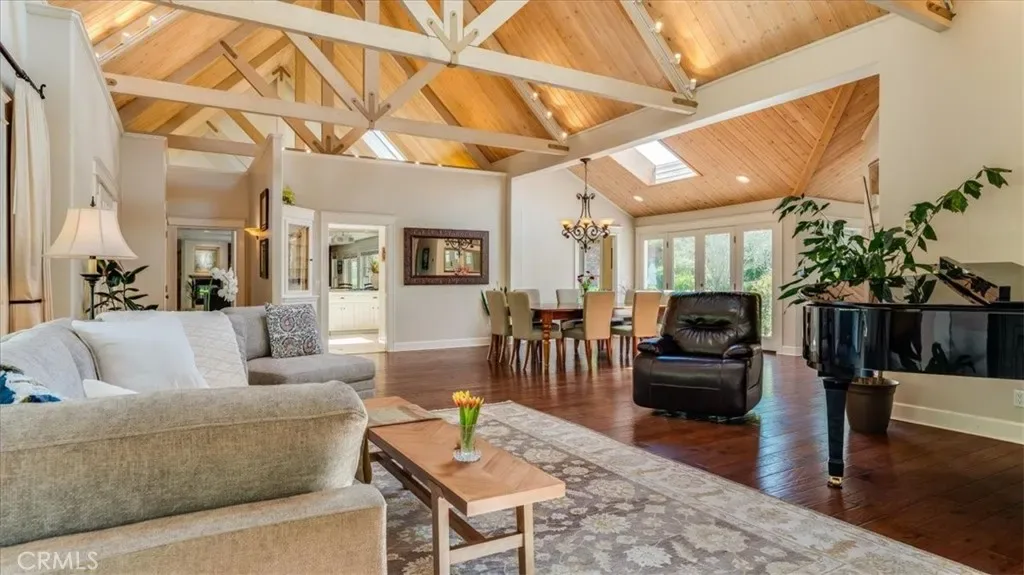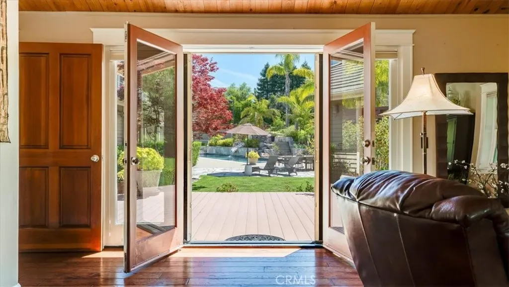 Hidden behind mature greenery and set well back from the road, this exceptional estate offers a rare blend of privacy, scale, and resort-inspired living in the coveted coastal enclave of Avila Beach. Encompassing approximately 7,000+ square feet of interior exterior living space – including decks and the workout room, the residence reflects a refined yet relaxed architectural style, thoughtfully designed for both everyday comfort and elevated entertaining. Sunlight pours through expansive windows and skylights, illuminating interiors that showcase soaring wood-beamed ceilings and rich hardwood floors. The home offers seven bedrooms and five bathrooms, including a convenient main-level suite and a private secondary living space complete with its own entrance, living area, and kitchen—ideal for guests, extended family, or flexible use. At the heart of the home, the kitchen combines warmth and function with quality appliances, generous prep space, and a natural gathering flow into the breakfast and family rooms. These spaces open directly to a covered, heated outdoor deck—perfect for year-round dining and effortless access to the pool and grounds. The primary suite serves as a peaceful retreat, featuring its own fireplace, built-in seating, and serene garden views. A spa-like bathroom includes a soaking tub positioned to overlook the landscape, a large walk-in shower, and thoughtful design elements that elevate daily living.