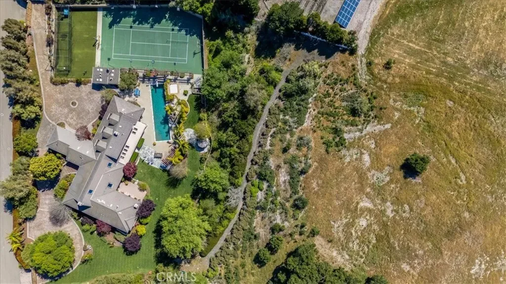 Outside, the property transforms into a private resort. A large pool and spa with cascading water features create a relaxing centerpiece, while stone pathways wind through beautifully landscaped gardens filled with intimate seating areas. Recreational amenities abound, including a full-size tennis court currently adapted for pickleball, a separate sports court, and a basketball area. Sitting behind the improved backyard is a large grassy knoll up the hill with spectacular views, primed for a multitude of options. An expansive outdoor entertaining space is equipped with a built-in kitchen, BBQ, pizza oven, and warming features—ideal for hosting gatherings in a truly unforgettable setting. Additional features include multizone radiant floor heating, high end HVAC system, multiple water heaters, a whole house water filtration system, surround sound speakers, a large movie projector with screen, dual electric meters, and a commercial-grade gas line—ensuring both comfort and efficiency.