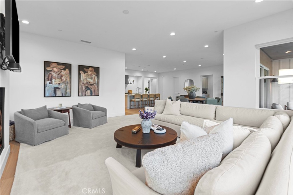 The expansive great room offers a gas fireplace, custom drapery, and large sliding glass doors opening to the landscaped backyard with covered paver patio, lawn, and private, tree-lined setting.