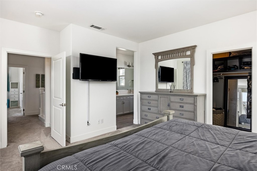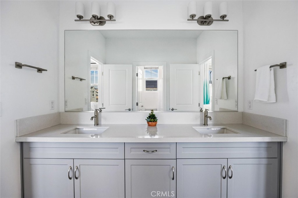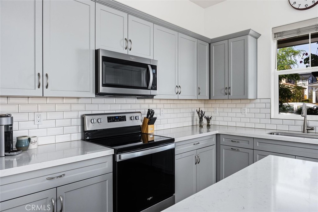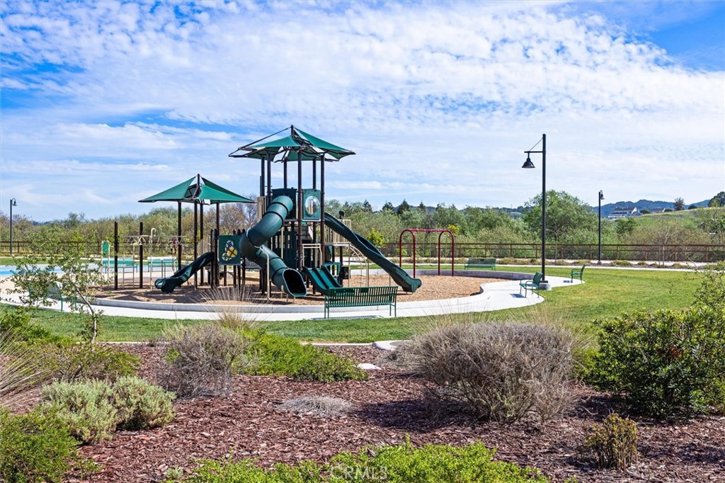 Welcome to 165 Earthwood Lane, a nearly new home in the desirable Avila Ranch community of San Luis Obispo. Built in 2023, this 3-bedroom, 2.5-bath residence offers approximately 1,808± sq ft of thoughtfully designed living space with modern finishes and owned solar. The light-filled main level features 10-foot ceilings, wood-look tile flooring, and an open layout connecting the living room to the outdoor patio for easy indoor-outdoor living. The kitchen is equipped with quartz countertops, subway tile backsplash, gray shaker cabinetry, a contrasting white island with bar seating, stainless steel appliances, and pantry storage, and flows seamlessly into the adjacent dining area. Upstairs, the primary suite includes large windows, a walk-in closet, and a well-appointed bath with dual vanities and a tile shower. Two additional bedrooms share a convenient adjoining bathroom with dual sinks and separate tub/shower area. A dedicated laundry room with washer and dryer and a hallway linen closet add everyday convenience. Outdoor spaces include a covered wrap-around front porch and a low-maintenance enclosed side yard with paver patio. Additional highlights include a main-floor powder room, under-stair storage, attached two-car garage, electric heating and air conditioning, and solar for energy efficiency. Located near parks, trails, shopping, and dining, this home offers comfortable Central Coast living in a popular community.