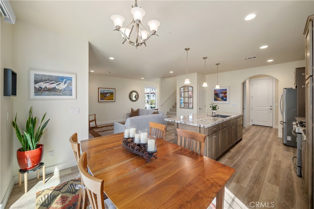 The designer kitchen is an entertainer’s dream, featuring an expansive island with bar seating, pendant lighting, and granite slab countertops. Premium alder cabinetry with soft-close features, LG appliances, a walk-in pantry, and an adjacent dining area with a striking hanging fixture create an ideal setting for gathering with friends.