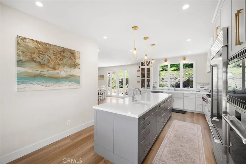 Completed in March 2023, the chef’s kitchen is the heart of the home and features top-tier Wolf appliances, a built-in Sub-Zero refrigerator, custom cabinetry, quartz countertops, and a deep farmhouse-style Rohl porcelain sink. A generous island with prep sink and seating for five anchors the space, complemented by a dry bar with wine refrigerator—ideal for entertaining. The space is completed by a show-stopping walk-in pantry.