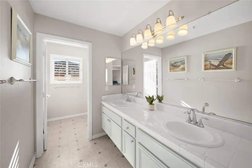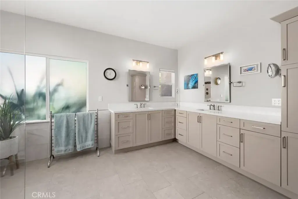 The primary bathroom, completed in 2021, offers a spa-like experience with a large zero-entry shower and dual vanities.