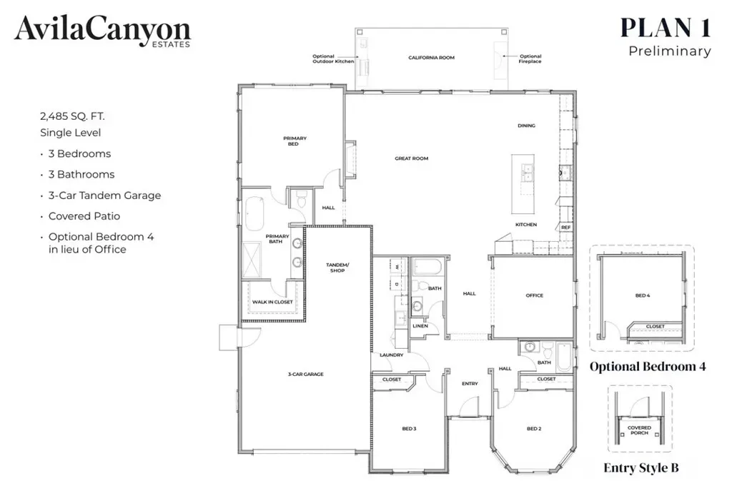 Set at the end of a private gated cul-de-sac within Avila Canyon Estates, this single-level new construction residence offers privacy, scenic surroundings, and refined Central Coast living. Positioned to capture views of the surrounding coastal hills, the home sits on an approximately 16,317.4± square foot lot with a landscaped front yard and fenced backyard. Spanning 2,485 square feet, the home features an open-concept design with 10-foot ceilings and abundant natural light. The great room is centered around a 55-inch linear fireplace and a dramatic 20-foot glass wall with a 10-foot sliding door that opens to a covered patio, creating seamless indoor-outdoor living. The rear of the home faces north toward seasonal wetlands, mature trees, and rolling hills, while the front enjoys southern exposure and canyon views. The home offers three bedrooms and an office, including a spacious primary suite and an option to convert the office into a fourth bedroom. The primary suite includes a walk-in closet and large bathroom with dual-sink vanities, a frameless shower enclosure with ceiling height tile and a generous layout designed for comfort and relaxation. At the heart of the home, the kitchen showcases quartz countertops, stain grade shaker cabinets, satin nickel hardware, and an oversized island designed for both everyday living and entertaining. Recessed lighting and clean architectural lines complement the home’s modern farmhouse aesthetic. Additional features include owned solar, air conditioning, forced-air heating, upgraded velvet finish paint, EV charger pre-plumbing, and energy-efficient dual-pane windows. The property also includes a three-car tandem garage with space suitable for an extra vehicle, storage, or recreational equipment. A limited number of homes remain available in Avila Canyon Estates, and depending on construction timing there may still be an opportunity to select certain finishes and upgrades. Located just minutes from Avila Beach, San Luis Obispo, Pismo Beach, hiking trails, golf courses, and local wineries, this newly constructed home provides convenient access to many of the Central Coast’s outdoor and coastal amenities.