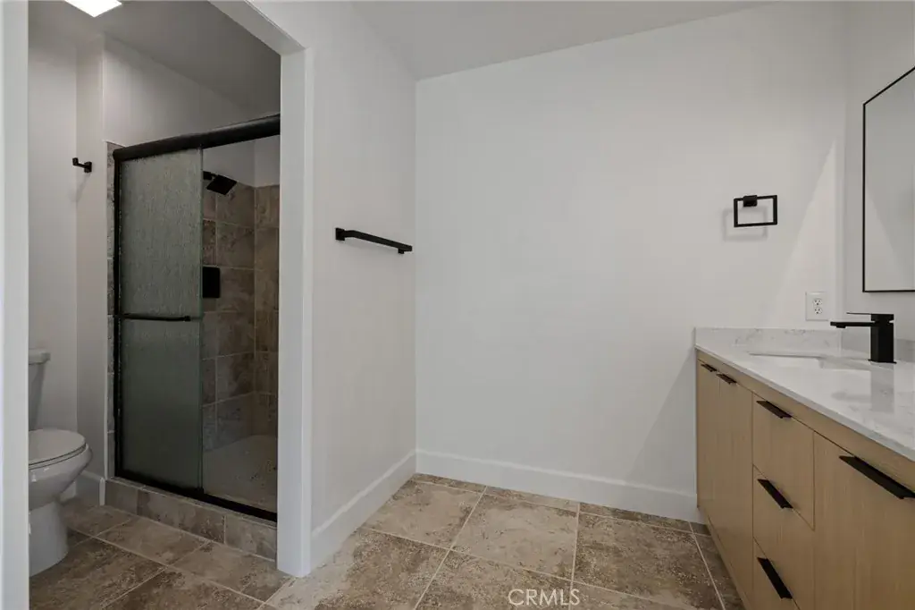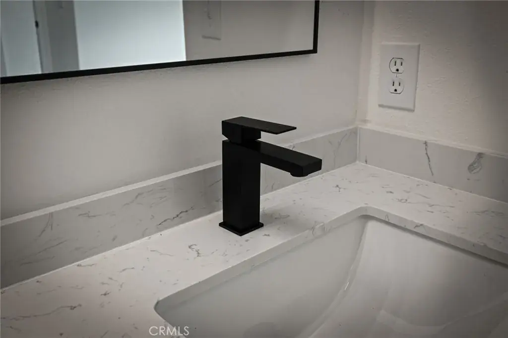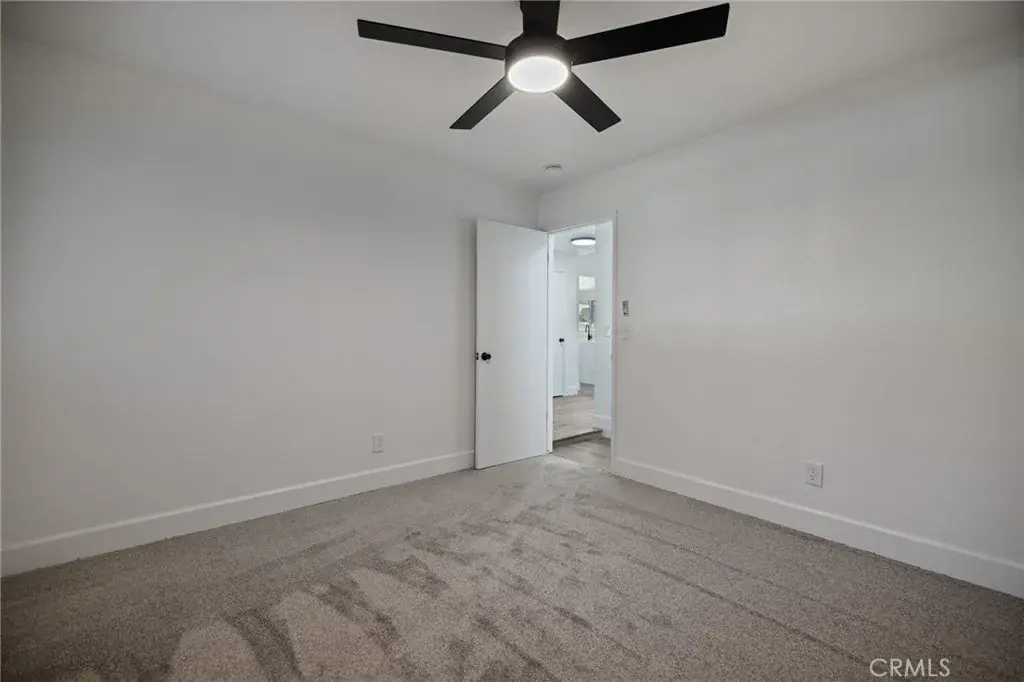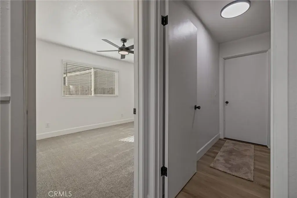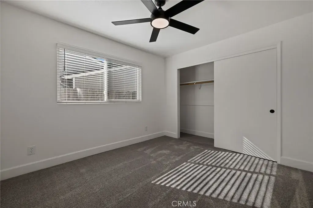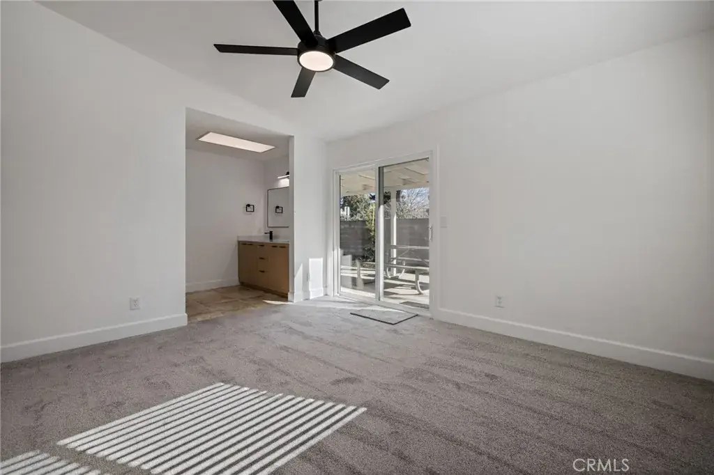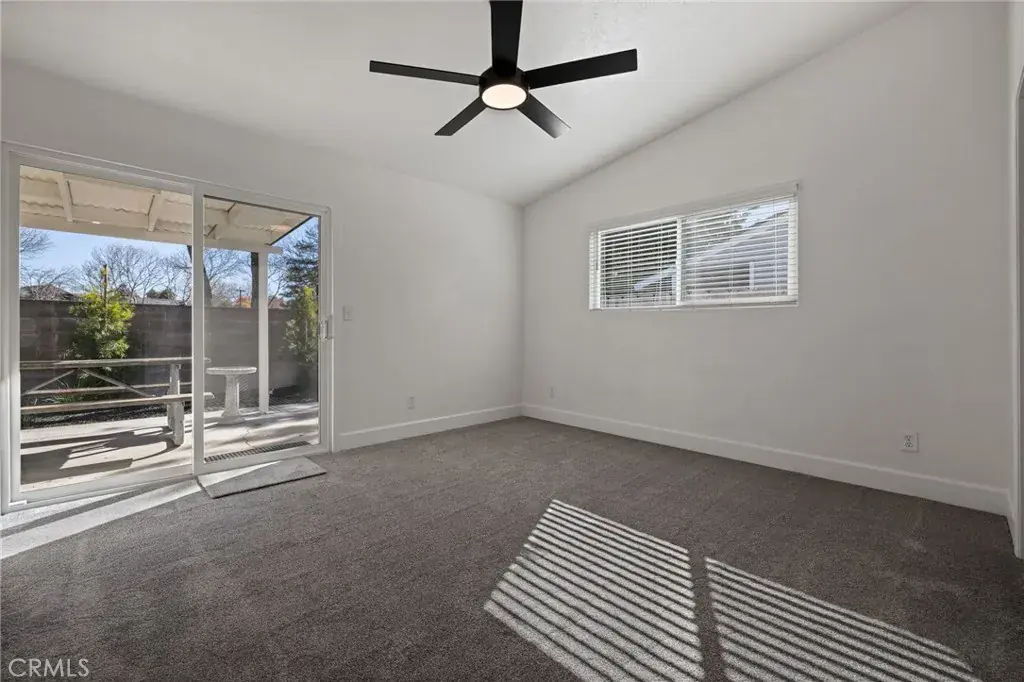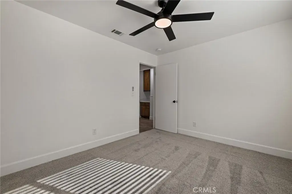 The guest bathroom offers all-new cabinets, an oversized mirror, and upgraded fixtures. Both secondary bedrooms provide comfortable space and include new ceiling fans. The primary suite features a walk-in closet, private sliding door to the back patio, and a new vanity with updated fixtures.
