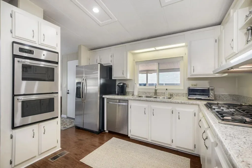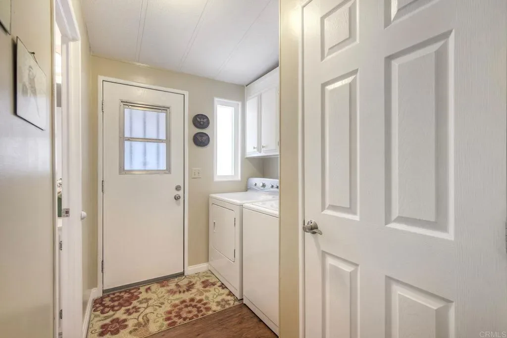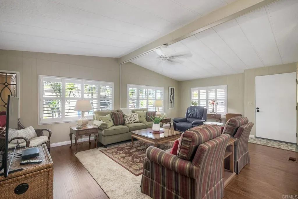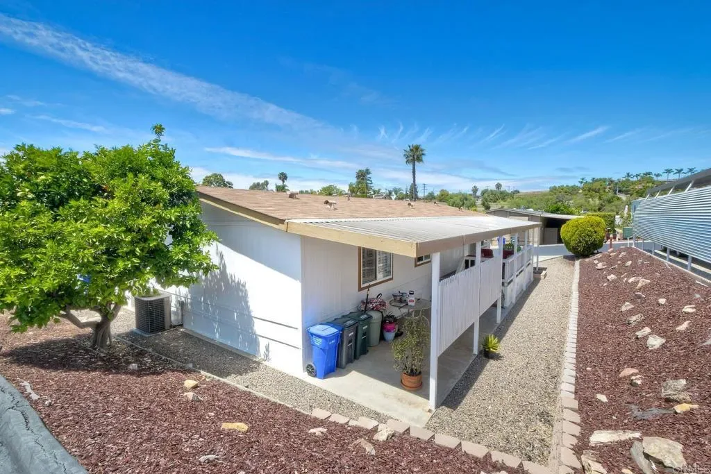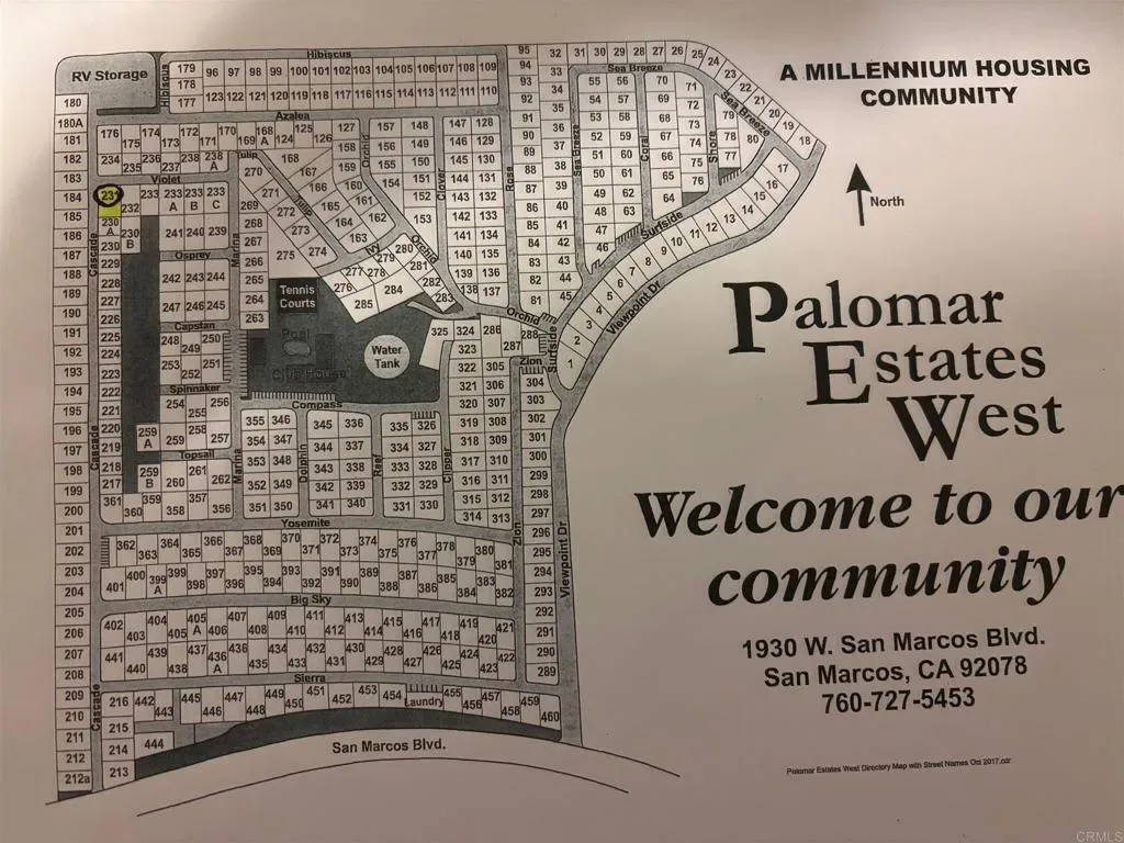 Welcome Home!!! Palomar Estates West, spc. 231. Beautiful 5-star Resort Living, Rent Controlled 55+ Community. This wonderful home is bright, great quality laminate flooring through-out, except carpet in both bedrooms. Double pane windows, shutters, central air/heating, gas stove & oven, gas washer/ dryer. All appliances convey. Enjoy the wonderful ocean breeze on the over-sized covered porch/patio. Spacious shed w/work bench & bright fluorescent lighting & built-in shelving. Low maintenance yard w/orange tree. Community amenities include – heated pool year-round, spa, sauna, billiard rm, card rm, library, clubhouse, shuffleboard, bocce ball, table tennis, darts, gym, pickleball, tennis, putting green, dog park, carwash & laundry mat. Land Lease – $739.95 Mo. Verify S/F COE. Park Approval Required.