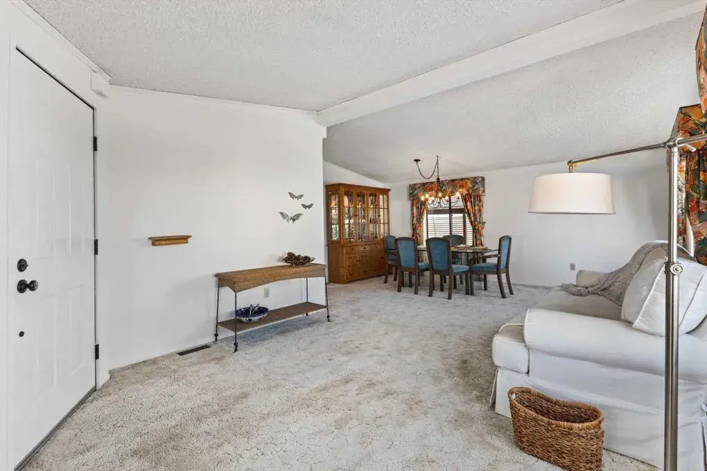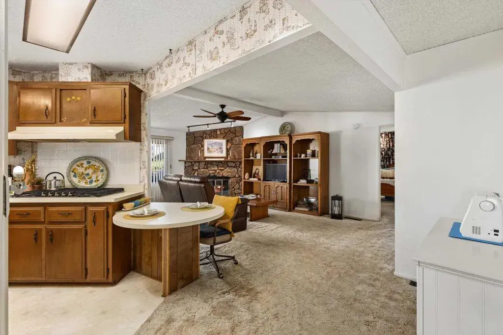 Spacious three-section home on a corner lot in a 55+ resort-style community with amenities and city rent control. Enjoy peekaboo ocean and sweeping sunset views from the living and dining room windows. New roof installed in 2025. This inviting home features vaulted ceilings, drywall interior, a formal living room and large family room with a full rock, wood-burning fireplace—ideal for entertaining. The kitchen offers a skylight, large pantry, built-in breakfast bar, and newer appliances. The primary suite includes a huge walk-in closet and ensuite bath with dual sinks, separate tub, and walk-in shower. The second bedroom also features it’s own ensuite bathroom with a shower. Outside highlights include a breezy covered porch, spacious side yard perfect for gardening with two citrus trees, and a storage shed. Rancho Vallecitos is a beautiful, 5-Star, resort style community for persons 55 years of age and over (2nd resident can be age 45+). One of the most beautiful manufactured home communities in California, Rancho Vallecitos has great views that can be enjoyed throughout the community, plus many social activities and amenities. Amenities include a clubhouse/recreation building, pool & spa, library, gym, billiards room, card tables, game and craft room, putting green, dog park, RV parking for an additional cost, and so much more! Monthly space rent is $740 and the park is under city rent control.