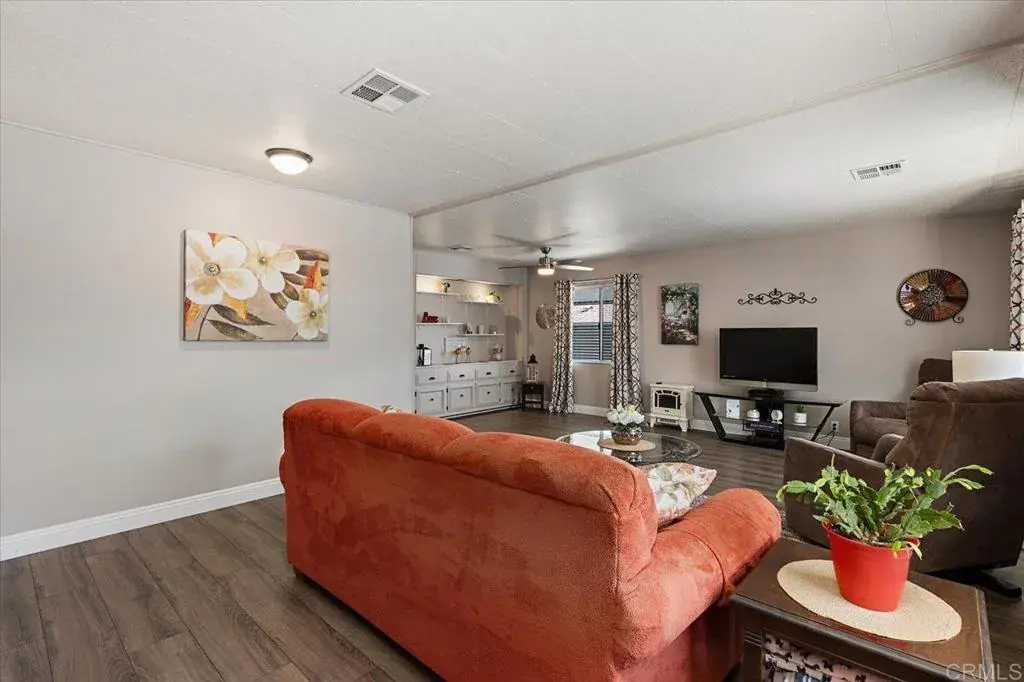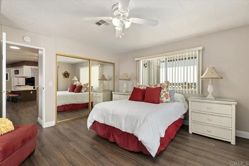 Lovely well cared for and updated home located in a 55+ resort style community with many amenities and city rent control! This home features waterproof Luxury Vinyl Plank floors throughout, as well as updated interior paint, molding, and fixtures. The Island Kitchen features new quartz counter tops, backsplash, and all newer appliances (with the exception of the oven.) This open floor plan has Separate Living and Family rooms providing plenty of space for leisure or entertaining. A solar tube in the Family room helps make this home feel bright and cheerful. The Primary Suite has a door that leads out to a raised garden bed and private back patio. There is Central A/C in addition to ceiling fans located in both bedrooms and the Living and Family room for a total of four. An oversized enclosed porch offers additional usable space not accounted for in the 1440 Sq.Ft.; This space makes a great sitting room, office, exercise or hobby room. The exterior offers TWO storage sheds for even more storage space. Rancho Vallecitos is a beautiful, 5-Star, resort style community for persons 55 years of age and over (2nd resident can be age 45+). One of the most beautiful manufactured home communities in California, Rancho Vallecitos has great views that can be enjoyed throughout the community, plus many social activities and amenities. Amenities include a clubhouse/recreation building, pool & spa, library, gym, billiards room, card tables, game and craft room, putting green, dog park, RV parking for an additional cost, and so much more! Space rent is $716.34 and park is under city rent control.
