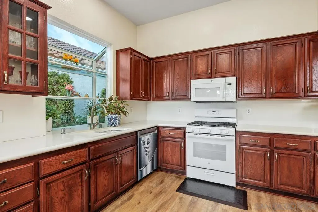 Welcome to your dream home in Lake San Marcos, featuring a lovely Brighton model in The Fairways with panoramic ocean, sunset views from the rear patio, living room and kitchen. The single story has 3 bedrooms, 2 full baths, 2- car attached garage and is situated on a private cul-de-sac. It was upgraded in 2022 with luxury vinyl flooring, quartz counter tops, recessed lighting, central air conditioning, newer plumbing in walls, the open atrium was enclosed adding 128 sq. ft to the former interior square footage, for a dedicated dining room, which could be converted to another bedroom, remodeled both bathroom showers, designer paint inside and out, and refreshed landscaping. The flowering perennials create a magical, relaxing space outside for entertaining. The interior cathedral ceilings and skylights allow natural light to pour inside all day long. Low hoa fees of $241 monthly including pool, spa, club house and common area. Schedule your private tour today to start living an exceptional life style at Lake San Marcos. Reduced $50k to sell! As a resident of The Fairways, you wil enjoy low HOA fees Of $241 that include a 24-hour security detail, access to a heated community pool and spa and club house. Also you can join the Lake and Lodge, $75 membership to have access to pickle, paddle ball and tennis courts, 2 additional pools, lawn area ant lake next to Amalfi restaurant, and 2 golf courses. Schedule your private tour today to start living an exceptional life style at Lake San Marcos.