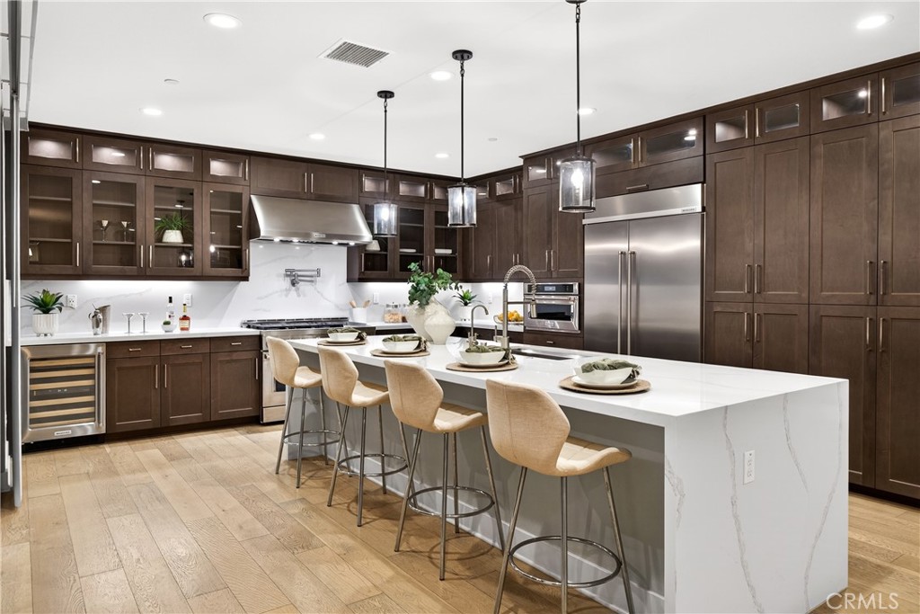 Professional-grade range and double ovens enable simultaneous cooking. Built-in wine fridge. Quartz spans the oversized island and perimeter countertops. Floor-to-ceiling soft-close cabinetry. Multi-panel window sliders retract completely, merging the great room with the covered patio. Thoughtfully landscaped backyard. Main-level guest suite with full bath provides privacy from upstairs sleeping quarters.