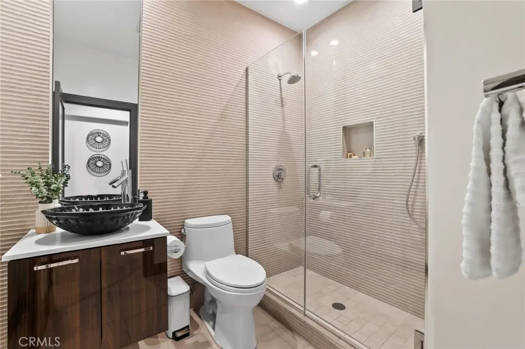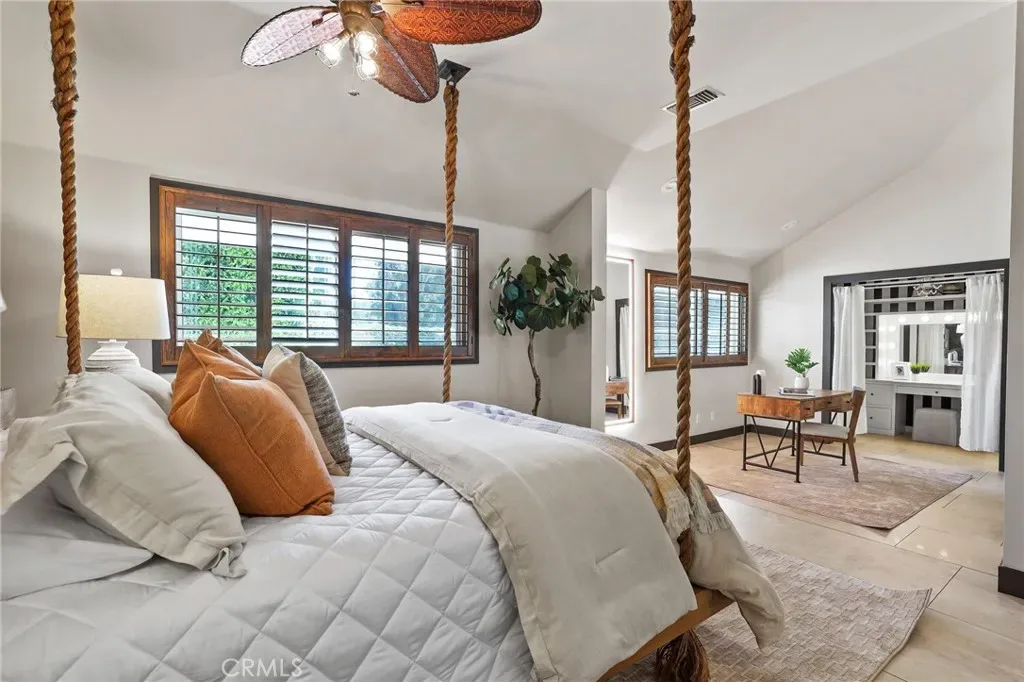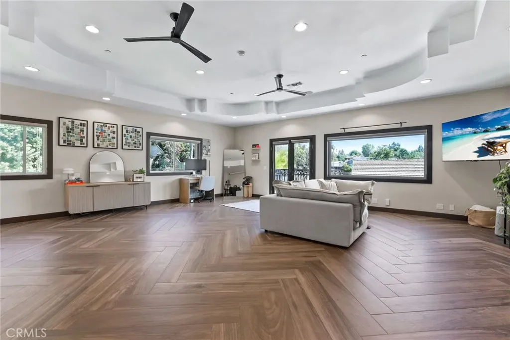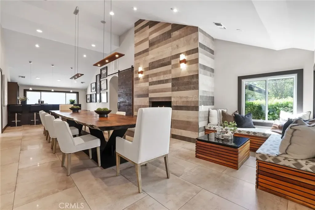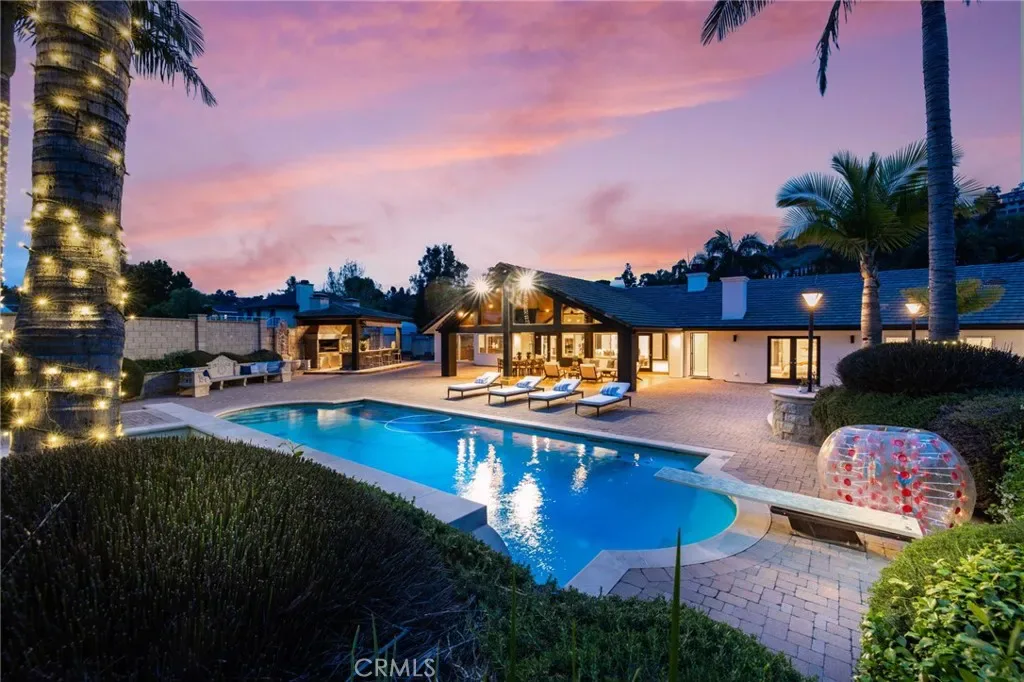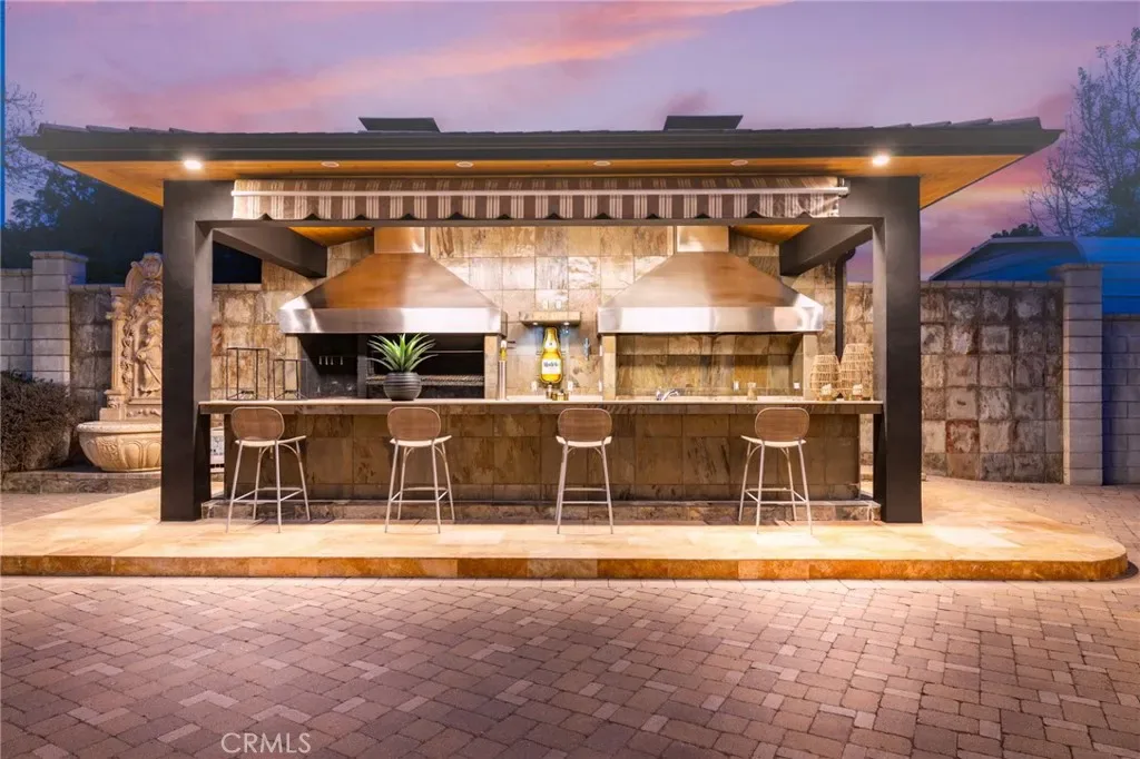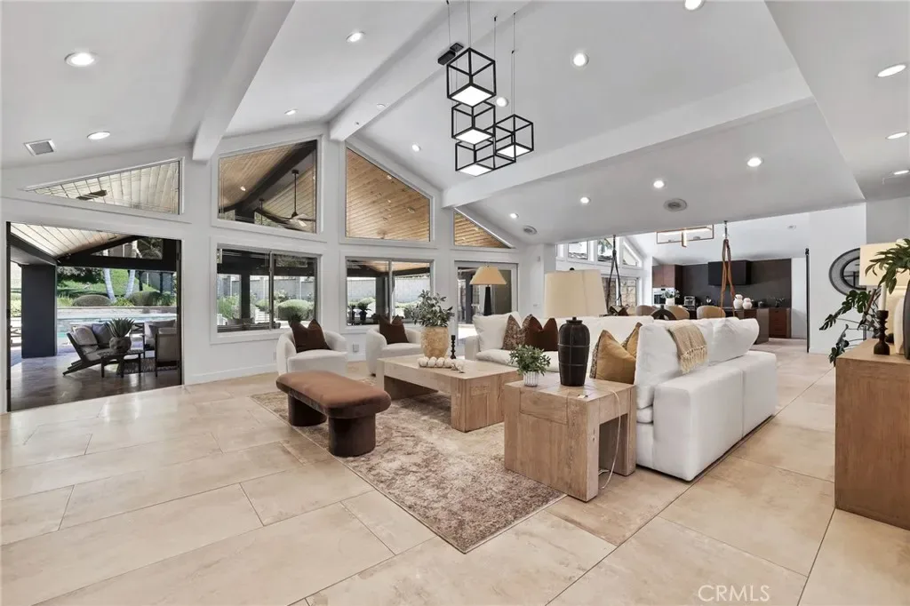 A truly one-of-a-kind single-level estate set on an expansive, flat, and fully usable 37,500+ square foot lot—offering a rare blend of scale, privacy, and lifestyle. The backyard sets the tone for the entire property—an immersive, resort-inspired retreat designed to elevate everyday living. A striking pool and spa serve as the focal point, surrounded by lush, professionally curated landscaping, fruit trees and an impressive motor court with ample space for RV and boat storage. A vaulted, wood-paneled pavilion and built-in BBQ entertainment island create an exceptional setting for hosting, while French doors open to a private casita exclusively accessed from the backyard. Inside the home, a separate staircase leads to a second private casita above the garage, offering both interior and exterior access—each complete with its own kitchen and full bath—seamlessly extending the outdoor living experience. All of this is tucked behind a private motorized gate, creating a grand sense of arrival that feels both exclusive and effortless. Inside, approximately 7,082 square feet of thoughtfully designed living space unfolds with a focus on scale, light, and architectural intention. The open-concept layout flows effortlessly through the main living areas, anchored by a showstopping, architecturally designed kitchen featuring dual oversized islands, bespoke flat-panel cabinetry, new professional-grade appliances, and sleek modern finishes. Walls of glass invite abundant natural light while blurring the line between indoor and outdoor living. Rich materiality defines the interiors, with custom stone accents, matte porcelain flooring, and soaring ceilings that create a warm yet contemporary aesthetic. Designed for flexibility and longevity, the home offers dual primary suites—one featuring a fireplace—along with two private casitas: one with exclusive exterior access and another above the four-car garage with both interior and exterior entry, each complete with its own kitchen and full bath. A library and additional ensuite bedrooms further enhance the home’s versatility. Complete with a state-of-the-art security system and perimeter cameras, the property offers both privacy and peace of mind. Ideally located moments from Crawford Canyon Park, this exceptional estate delivers a rare combination of presence, design, and resort-style living in one of North Tustin’s most sought-after neighborhoods.