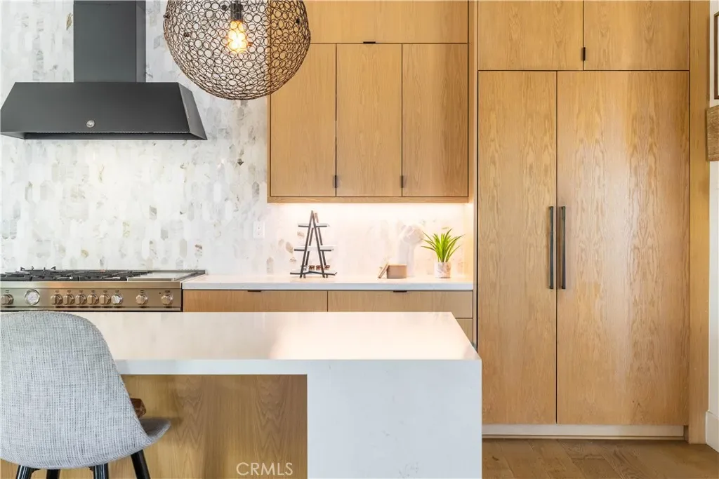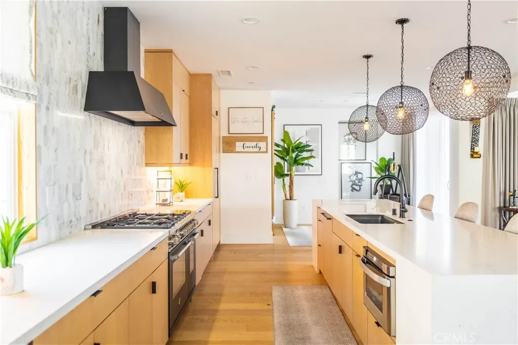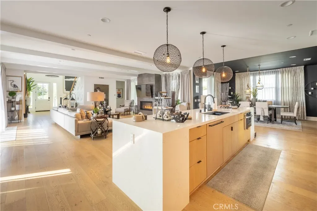 The chef’s kitchen is the centerpiece of the home, showcasing a massive quartz island, modern wood cabinetry, black appliances, and statement accent lighting. It flows seamlessly into the family room and opens to a spacious entertaining patio with hillside views — ideal for indoor-outdoor California living.