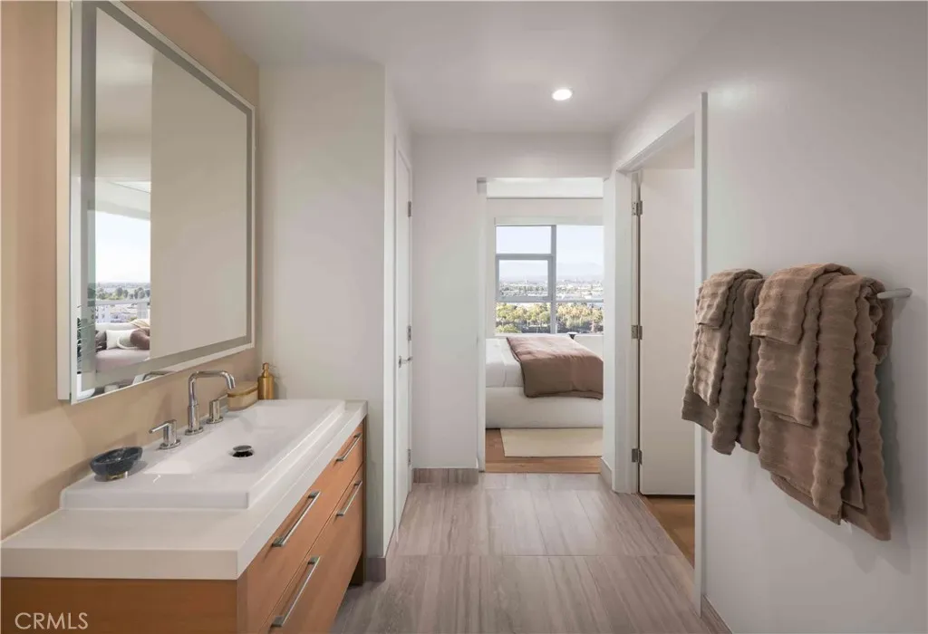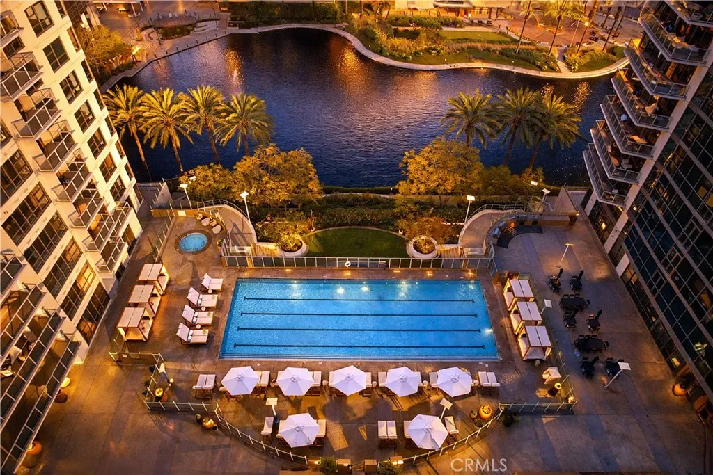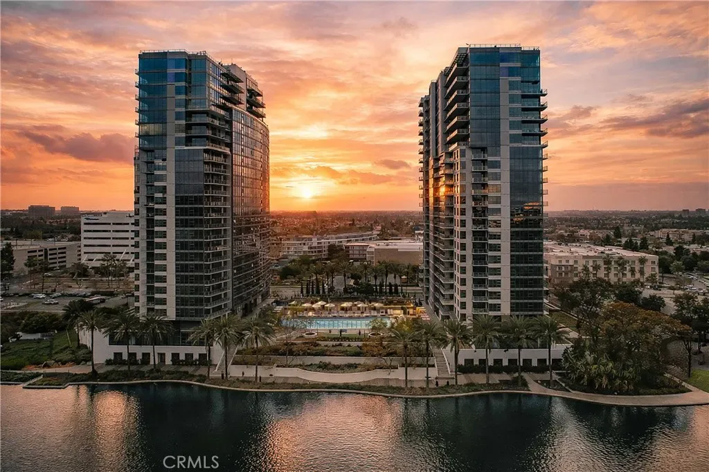 Residence N403 is a one-of-a-kind opportunity at Skyline OC. This is the only floor plan of its kind and the only residence offering a half bath. This corner home is ideally positioned directly above the lake, with southeast-facing views that capture water, city, and morning light from expansive windows. At approximately 1,227 square feet, this one-bedroom residence features an open living and dining area that flows seamlessly to a private patio overlooking the lake. Wood flooring runs throughout the living, dining and kitchen, while complemented by a well-appointed kitchen. The spacious primary includes an en-suite bath, while the additional half bath offers rare convenience for guests. With its unique layout and coveted location, Residence N403 is one of the most distinctive homes at Skyline OC.