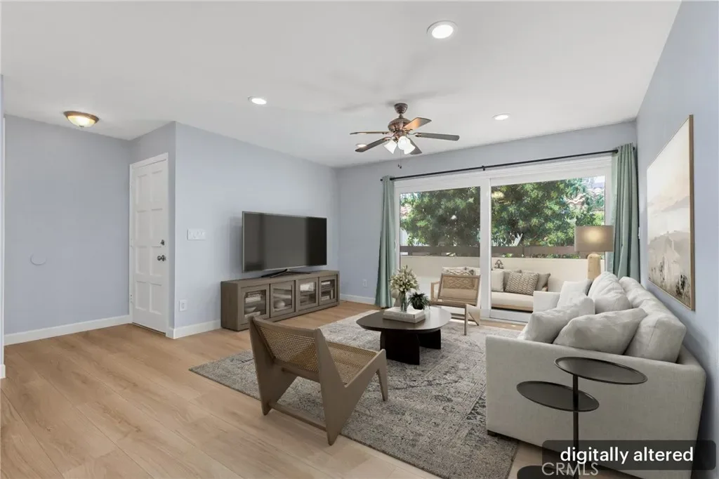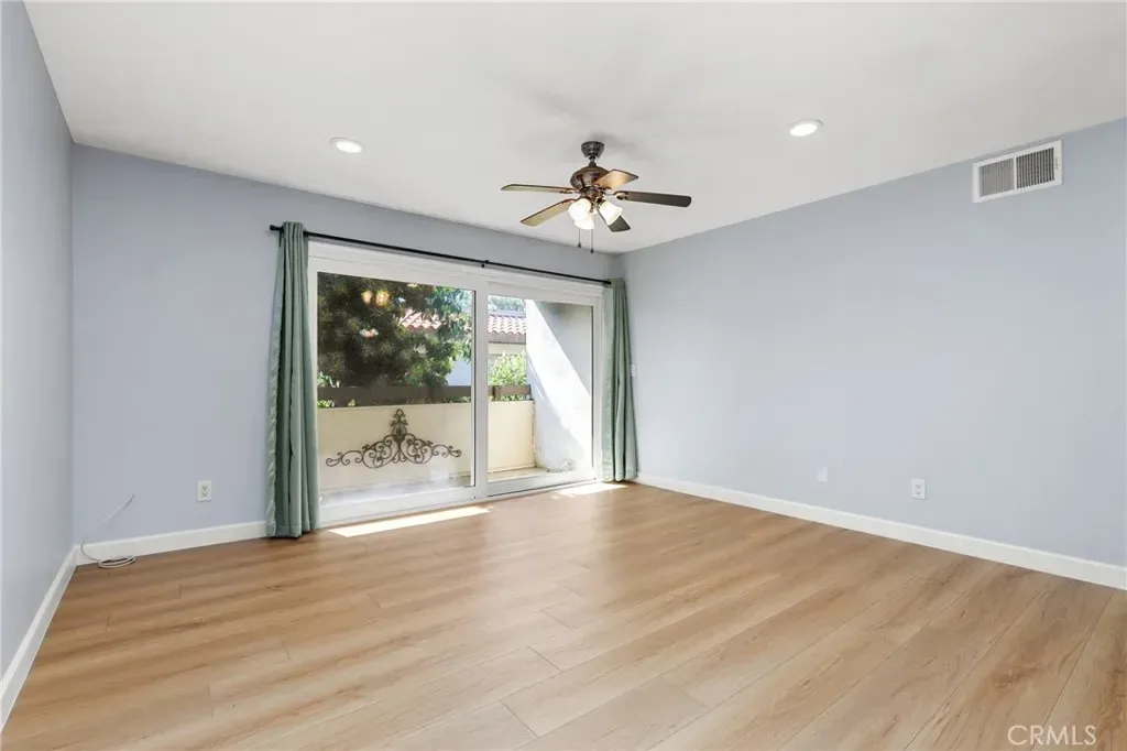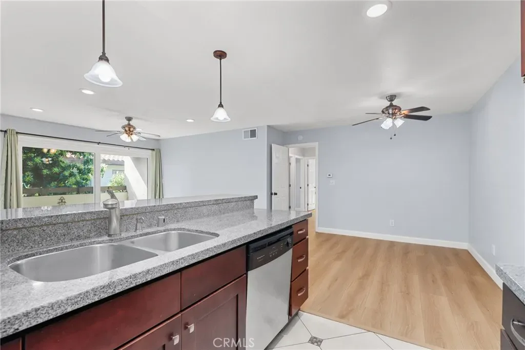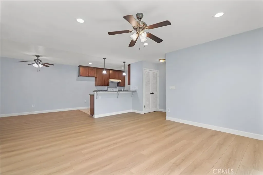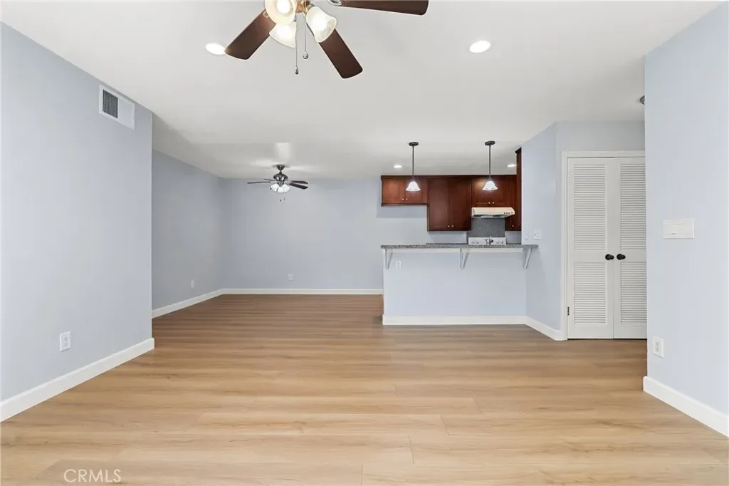 Welcome to this immaculate upper-level condo in the desirable Woodside Village neighborhood of Santa Ana. Thoughtfully updated and move-in ready, this light-filled home features wide plank luxury vinyl flooring throughout, fresh interior paint, and recessed lighting that enhances the modern, airy feel. The inviting living room opens to a private balcony—perfect for morning coffee or relaxing evenings. The well-designed floor plan offers comfortable living with a seamless flow between the living, dining, and kitchen areas, ideal for both everyday living and entertaining. Bathroom with upgraded, remodeled shower. Located within a gated community, Woodside Village offers resort-style amenities including sparkling pools, a clubhouse, and beautifully maintained lush green spaces, creating a peaceful and welcoming environment. Conveniently situated near shopping, dining, and major freeways, this home combines comfort, style, and accessibility in one exceptional opportunity.