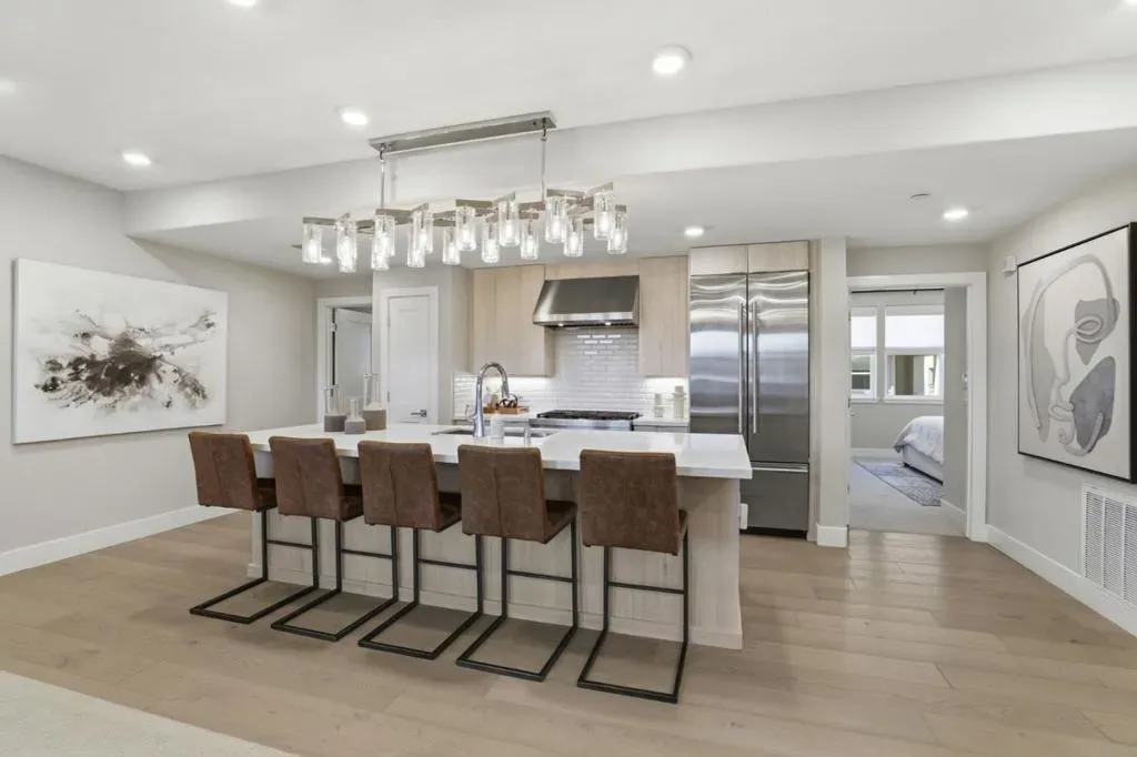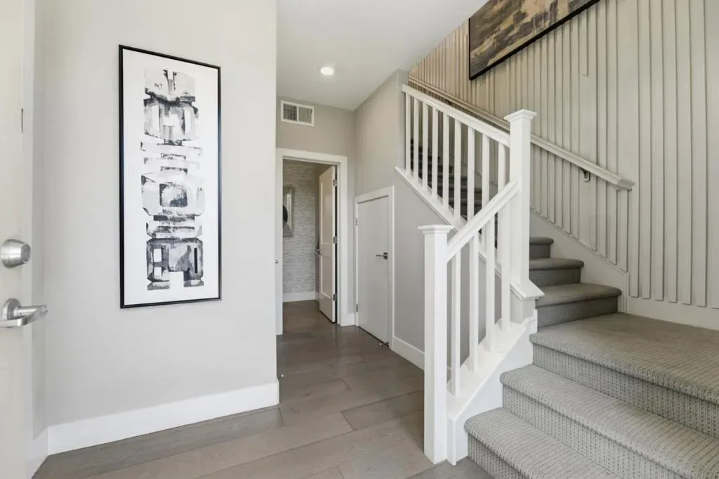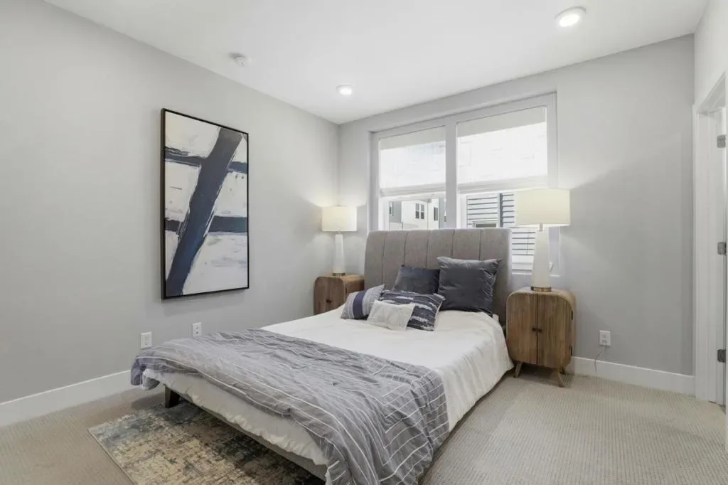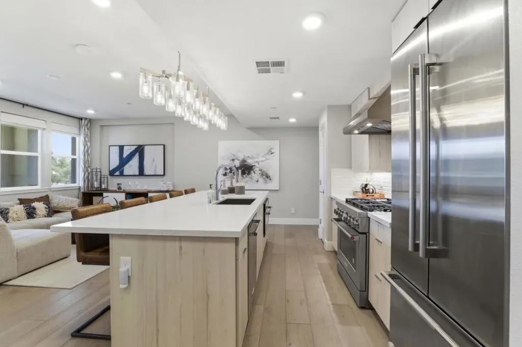 FULLY TURNKEY and SOLD FULLY FURNISHED – this is not staging. This private corner-lot former Toll Brothers model home includes designer-selected furniture, décor, artwork, an OWNED 9-panel solar system, and over $200K in upgrades, with rare privacy and no direct neighbors on three sides. The sunlit main level offers an open-concept layout connecting the designer kitchen, living room, office nook, and dining area, plus a covered balcony. High ceilings, designer lighting, hardwood floors, quartz slab countertops, a white brick tile backsplash, slate-panel cabinetry, a massive island, a KitchenAid range, and a built-in refrigerator elevate the space. Both spacious suites feature modern en-suite baths, including a luxurious primary with double vanity, walk-in shower, and walk-in closet. Additional highlights include a powder room, an attached 2-car garage, a laundry area, a tankless water heater, and smart controls. Enjoy low Santa Clara utilities and a prime location near Costco, Whole Foods, Lawrence Caltrain, NVIDIA/Apple/Google/Meta, and easy freeway access.