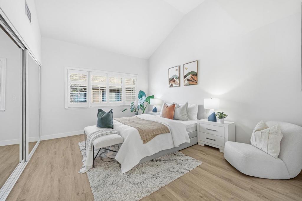 Stunning End-Unit with Private entrance in the prestigious Miramar Terrace gated community! Fully remodeled in 2021, this bright and spacious home features an open living/dining area with high ceilings and tons of natural light, leading to a large private balcony. The remodeled kitchen boasts quartz countertops, beautiful backsplash, white shaker cabinets, and SS appliances. Bathrooms are upgraded with sleek fixtures, quartz counters, and designer tile. The Expansive master suite offers vaulted ceiling, dual closets, and dual-sink vanity. Second bedroom includes walk-in closet. Additional highlights include recessed lighting, plantation shutters, central A/C, in-unit laundry, and extra storage unit. Two parking spaces plus ample guest parking. HOA covers water, gated entry, security patrols, garbage, gas, and amenities including pool, spa, clubhouse, sauna, and gym. Ideally located in the heart of Santa Clara near Santana Row, Valley Fair, Nob Hill, Ponderosa/Eklund parks, restaurants, and major tech companies.