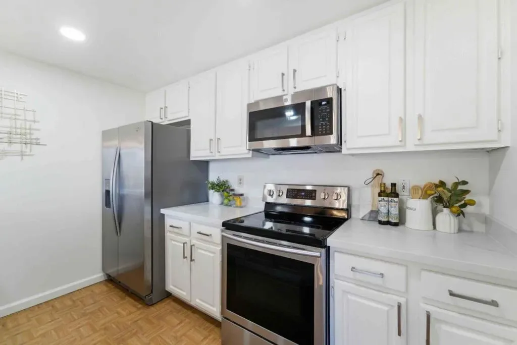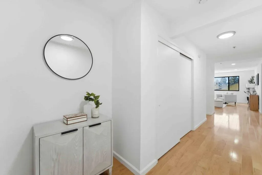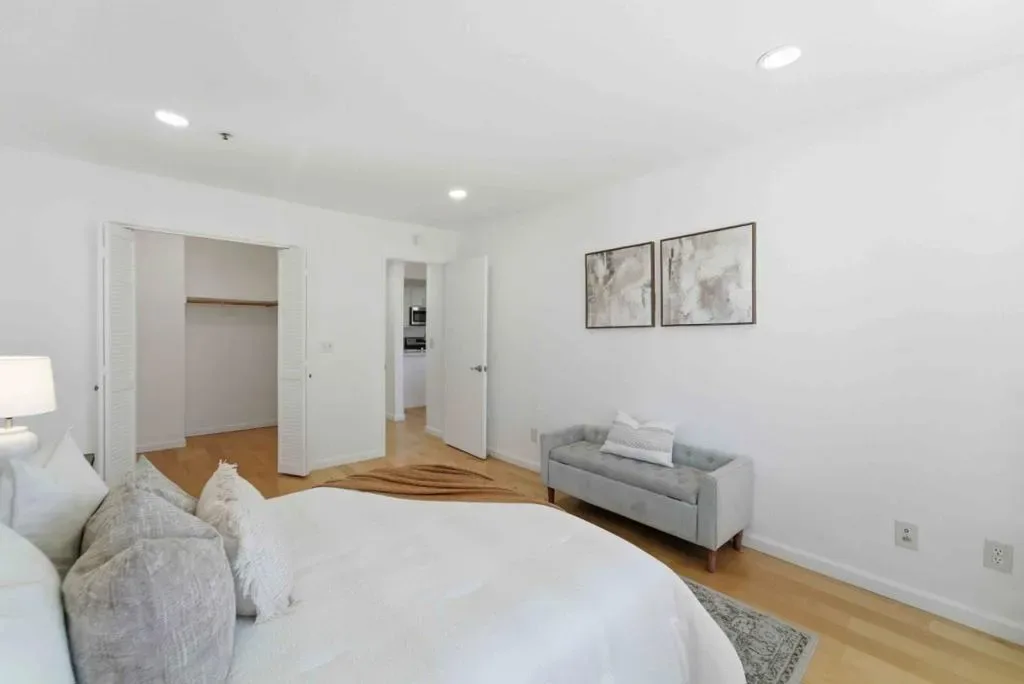 Stunning and Largest unit you will find under $800K. 1456 sq feet is larger than some surrounding single family homes. This gated community keep you from the risks of a carport. This one story unit in gated community with an elevator is the perfect “Roommate Floorplan”- with beds and baths on opposite sides of the unit. Fabulous sought after open concept allows interaction from in kitchen with quartz counters to living & dining rooms. Freshly painted and recessed lights creates a modern vibe. Large windows allows natural light and spacious terrace offer views you can enjoy from a high floor. Primary bedroom is approximately 15′ by 11′ and offers plenty of room for an office space or work out area. Baths have elegant quartz counters, large closets & bathtub/shower. Secondary bedroom is a massive 17′ by 11′ with bay window & walk in closet. Intelligent design means one partial shared walls (see diagram) . Other extras: brand new AC ($12K to install), Full size Washer/ Dryer, Refrigerator, storage closet, elevator, 2 parking spaces, trash chute, low Santa Clara utilities and packages delivered to your door! HOA covers a ton! Hot and Cold water, swimming pool, rec room) and pool table. Easy commute to Apple, Nvidia. Enjoy the peace that a high floor offers.