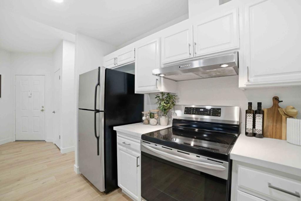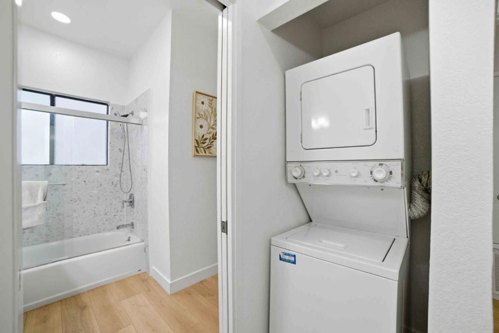 Gorgeous Top Floor Penthouse condo with stunning vaulted ceilings! All prepped for you with new paint (no popcorn ceiling) and wide plank laminate floors. Enjoy an open kitchen with quartz counter top that seamlessly connects kitchen, dining and living space (watch TV from kitchen :-) Inside laundry, AC, refrigerator, wood burning fireplace, lots of big windows. Gated community and 2 secure underground parking spaces. Great location in North Santa Clara for easy access to Tech companies. Also walking distance to grocery story and 24 hour Fitness. Vaulted ceilings are rare. Great perk of Low Santa Clara utilities. Electricity does not come from PGE.