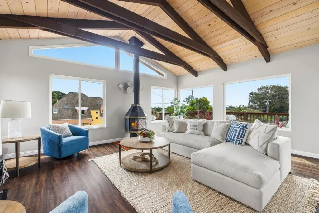 Beach living at its best! Only 6 doors from the oceans edge. Feel the rush of salt air on your skin, and waves crashing moments from your door. This expansive, generous, well maintained coastal home with 2 separate living areas is in the coveted Avenues Area of Santa Cruz, set between Pleasure Point and the Boardwalk. Within easy walking of world-famous surf breaks, neighborhood beaches, cafés, shops, breweries, and the Saturday Farmers Market. It is designed to function as 2 distinct living areas, ideal for multi-generational living, shared ownership, or extra rental income. The main level features a welcoming entry with space for boards and beach gear, a generous open living area with floor to ceiling fireplace, rich dark wood floors, large windows, a separate dining area, two large bedrooms, and 2 updated full baths. The lush backyard includes a private deck and patio for outdoor dining and relaxing. Upstairs, with its own exterior and interior access, is a bright second living space with open-beamed ceilings, a wood-burning stove, kitchen, living room, walls of windows, and ocean views from the extra-large private second-story deck, Bedroom and a full bath complete the upper level. Minutes from Sunny Cove, Blacks, Corcoran Lagoon, and Twin Lakes beaches. RV & boat parking.