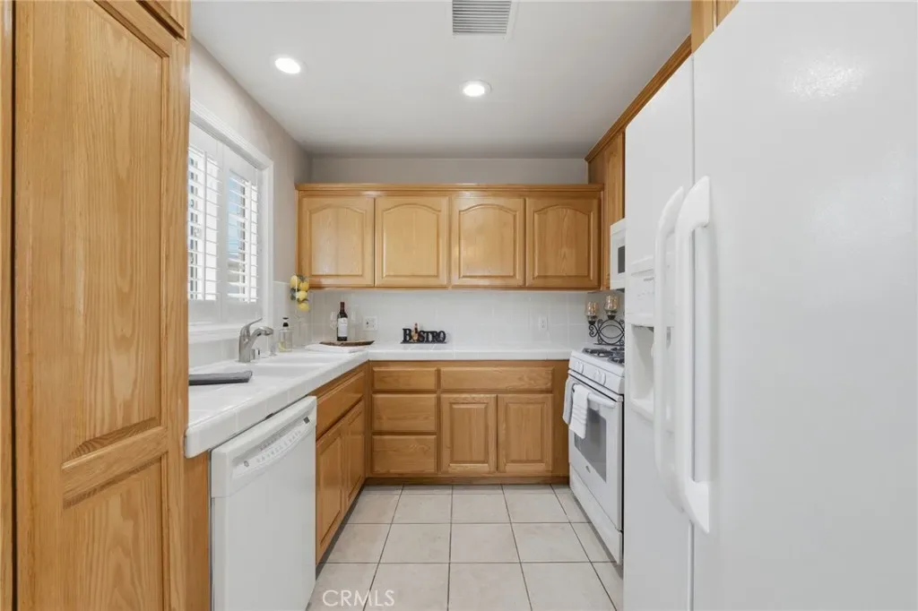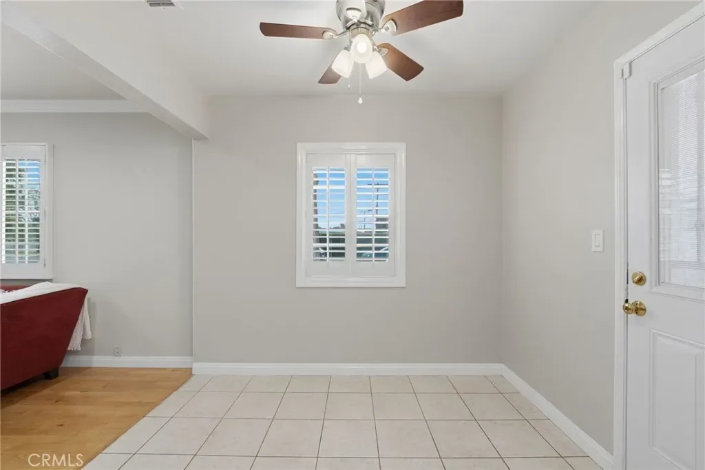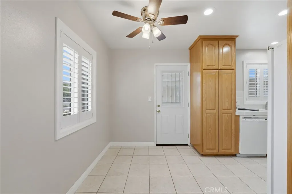 The bright and inviting kitchen comes fully equipped with a refrigerator, stove, microwave, and dishwasher, along with a tall pantry cabinet for extra storage. There’s also a cozy dining area within the kitchen, ideal for everyday meals and gatherings. Throughout the home, elegant white shutters add a clean, timeless touch to nearly every window.