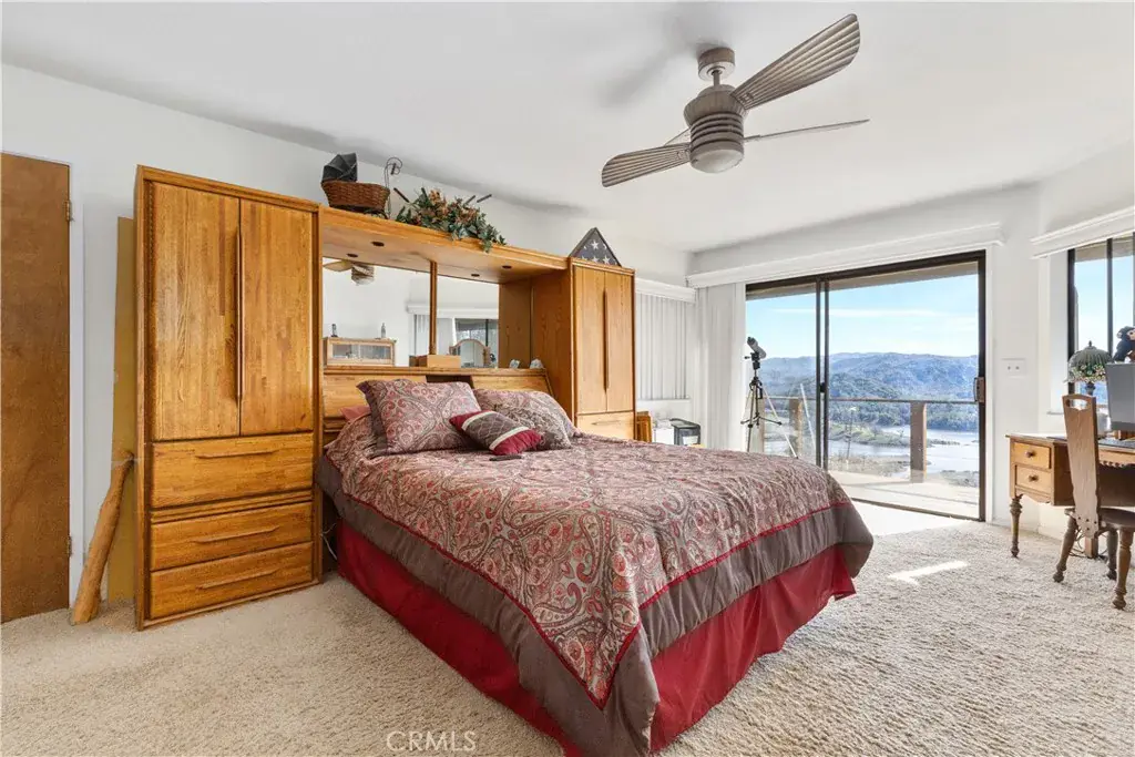 The primary suite has it’s own wing with incredible views of the lake both inside and off it’s deck. The on-suite bath is spacious with separate vanities, soaking tub, and shower. The suite is equipped with two wardrobe closets and a walk-in closet…no need to worry about a place for your belongings! Another main-level bedroom is in the west wing with a 3/4 bathroom. Downstairs are two more rooms and one bathroom with a shower. The indoor laundry room is furnished with a washer, dryer, sink, hidden ironing board, and built-in storage. The frontage acreage is sometimes used for cattle or horses and is cross-fenced. Nearby is the workshop with a concrete floor and a Dunn barn with a concrete floor that was once used for housing. The ideal mixture of usable land and a mountain top home!