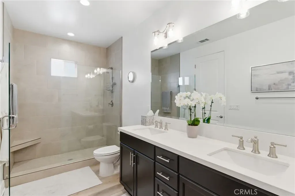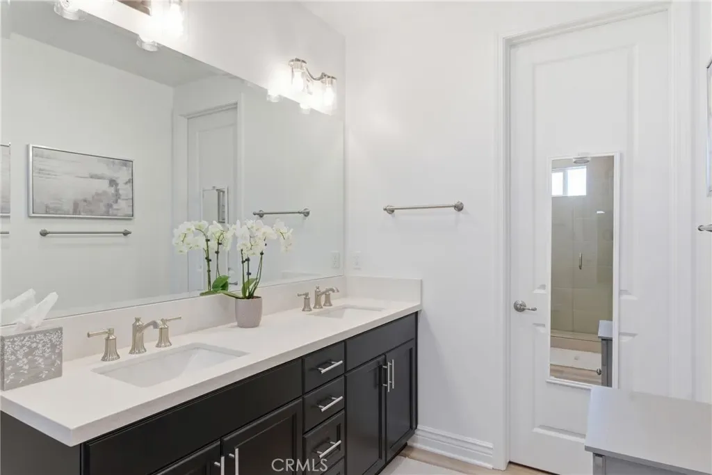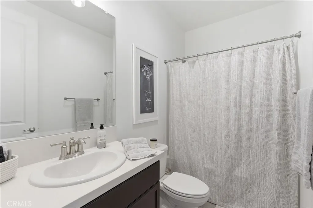 A downstairs bedroom with an en suite bath provides flexibility for single level living, guests or multi-generational living. Upstairs, a loft offers space for an office, media room, or play area, along with a laundry room. The primary suite features dual sinks, a large shower, and a walk-in closet. Two additional bedrooms and a full bathroom complete the upper level. Additional features are tankless water heater and custom Hunter Douglas window treatments throughout.
